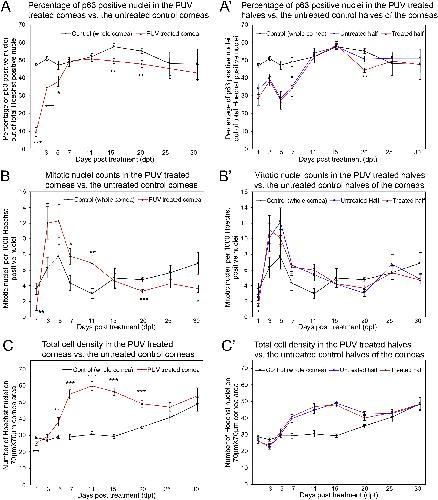 Fig. 7. Quantification of p63 positive nuclei, mitosis, and total cell density following PUV treatment on whole corneas and half corneas. (AâC) Percentage of p63 positive nuclei, mitotic nuclei counts (H3S10), and total cell density, respectively, in the untreated controls (whole cornea) (black lines) vs. the PUV treated whole corneas (red lines). (Aâ²-Câ²) Percentage of p63 positive nuclei, mitotic nuclei counts (H3S10), and total cell density in the untreated control half (blue lines) vs. the PUV treated half (red lines) of the cornea. The controls (whole cornea) from (AâC) have been included in (Aâ²-Câ²), respectively, for convenience of comparison (black lines). The observations have been taken at the time points indicated on the X-axis, as days post treatment (dpt). Error bars indicate standard error of the mean. Statistical analysis has been done for untreated control corneas (black lines) vs. PUV treated corneas (red lines) in (AâC), and for untreated control halves (blue lines) vs. the PUV treated halves (red lines) of the corneas in (Aâ²-Câ²). N = 7-10 for time points in (A). N = 10-15 for time points in (Aâ²). N = 7-13 for time points in (B). N = 9-15 for time points in (Bâ²). N = 9-13 for time points in (C). N = 10-15 for time points in (Câ²). *** = p ⤠0.001; ** = p ⤠0.01; * = p ⤠0.05. (For interpretation of the references to color in this figure legend, the reader is referred to the Web version of this article.) |