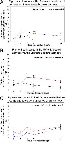 Fig. 8. Quantification of pigmentation in Psoralen only (whole cornea), UV only (whole cornea), and UV only (half cornea) controls. (A) The contralateral control corneas (black line) show a minimal level of pigmentation. Only slightly elevated levels of pigmentation were observed in Psoralen only whole cornea treatment controls (blue line). A significant increase was only observed at 7dpt. (B) When compared to the contralateral untreated corneas (black line), UV only treatment on whole corneas (red line) appears to cause a significant increase in the levels of pigmentation at 5, 7, and 15dpt. However, pigmentation was still minimal in the UV only treated controls at these time points. (C) In the cases where only half of the cornea received UV treatment, the treated halves (red line) show minimal increases in pigmentation at 1-7dpt. Error bars indicate standard error of the mean. Statistical analysis has been done for control cornea vs. Psoralen only treated (A), control cornea vs. UV only treated (B), and untreated halves vs. the UV only treated halves of the corneas (C). N = 4 for all time points in (AâC). *** = p ⤠0.001; ** = p ⤠0.01; * = p ⤠0.05. (For interpretation of the references to color in this figure legend, the reader is referred to the Web version of this article.) |