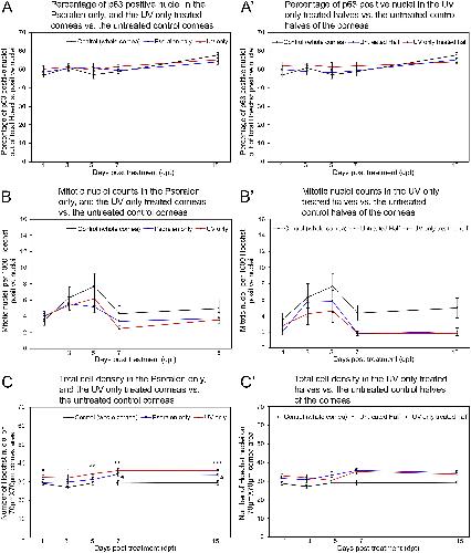 Fig. 11. Quantification of p63 positive nuclei, mitosis, and total cell density in Psoralen only (whole cornea), UV only (whole cornea), and UV only (half cornea) controls. At each time point observed, the percentage of p63 positive nuclei (A), and mitotic nuclei counts (B) were similar among the untreated controls (black line), Psoralen only controls (blue line), and UV only controls (red line), respectively. (C) Compared to the untreated controls (black line), the total cell density is significantly higher at 7 and 15dpt in Psoralen only controls (blue line), and significantly higher at all time points in UV only controls (red line). Percentage of p63 positive nuclei (Aâ²), mitotic nuclei counts (Bâ²), and total cell density (Câ²) in both the untreated (blue line) and treated (red line) halves of the UV only treated half cornea controls show similar levels, respectively. The controls (whole cornea) from (AâC) have been included in (Aâ²-Câ²), respectively, for convenience of comparison. Error bars indicate standard error of the mean. Statistical analysis has been done for controls (whole cornea) vs. Psoralen only treated, and controls (whole cornea) vs. UV only treated in (AâC), and untreated halves vs. the UV only treated halves of the corneas in (Aâ²-Câ²). N = 6-7 for Psoralen only treated, UV only treated, and UV only half treated at all time points in (A-C, Aâ²-Câ²). N = 9 for controls (whole cornea) for all time points in (A, C, Aâ², Câ²). N = 7-9 for controls (whole cornea) for time points in (B, Bâ²). *** = p ⤠0.001; ** = p ⤠0.01; * = p ⤠0.05 (for UV only vs. controls (whole cornea)). # = p ⤠0.05 (for Psoralen only vs. controls (whole cornea)). (For interpretation of the references to color in this figure legend, the reader is referred to the Web version of this article.) |