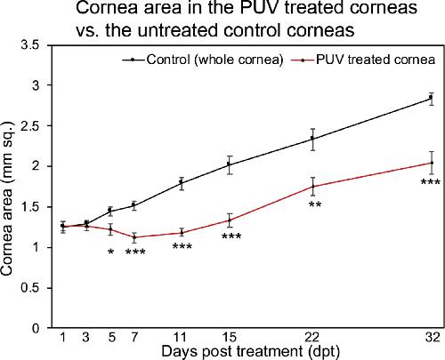 Supplementary Fig. 1. (Fig. S1): Quantification of cornea area following PUV treatment on whole corneas. (supplements data in Fig. 2AâD, 2Aâ²-2Dâ²) Control corneas that received no PUV treatment show a steady increase in cornea area (black line). Corneas that received PUV treatment (red line) showed continued growth that was initially delayed compared to the control cornea. Error bars represent standard error of the mean. Statistical analysis has been done for untreated control corneas vs. PUV treated corneas. N = 7-12 for the time points, except for control cornea at 1dpt (N = 4). *** = p-value ⤠0.0003. ** = p-value ⤠0.005; * = p value ⤠0.05. |