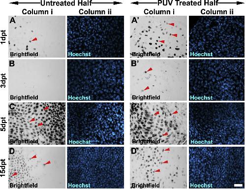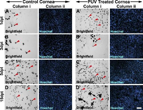 Supplementary Fig. 4. (Fig. S4): TUNEL assay for cell death analyses following PUV treatment on whole corneas. (supplements the data in Fig. 6B) Representative brightfield images of TUNEL positive nuclei are shown (Column i), alongside corresponding Hoechst images (Column ii), for the time points indicated as days post treatment (dpt). (A-D) and (A′-D′) correspond to 1, 3, 5, 15dpt for untreated control corneas and PUV treated corneas, as indicated. A significant increase in apoptosis levels in PUV treated corneas, as compared to control corneas was only observed at 1dpt. No significant differences were observed at other time points. Note presence of invading pigment cells in the PUV treated case shown in (D′). Red arrowheads indicate representative TUNEL positive nuclei and black arrows indicate pigment cells, which are larger and have a distinct color and irregular shape. Scale bar in D′ column ii is 50 μ |