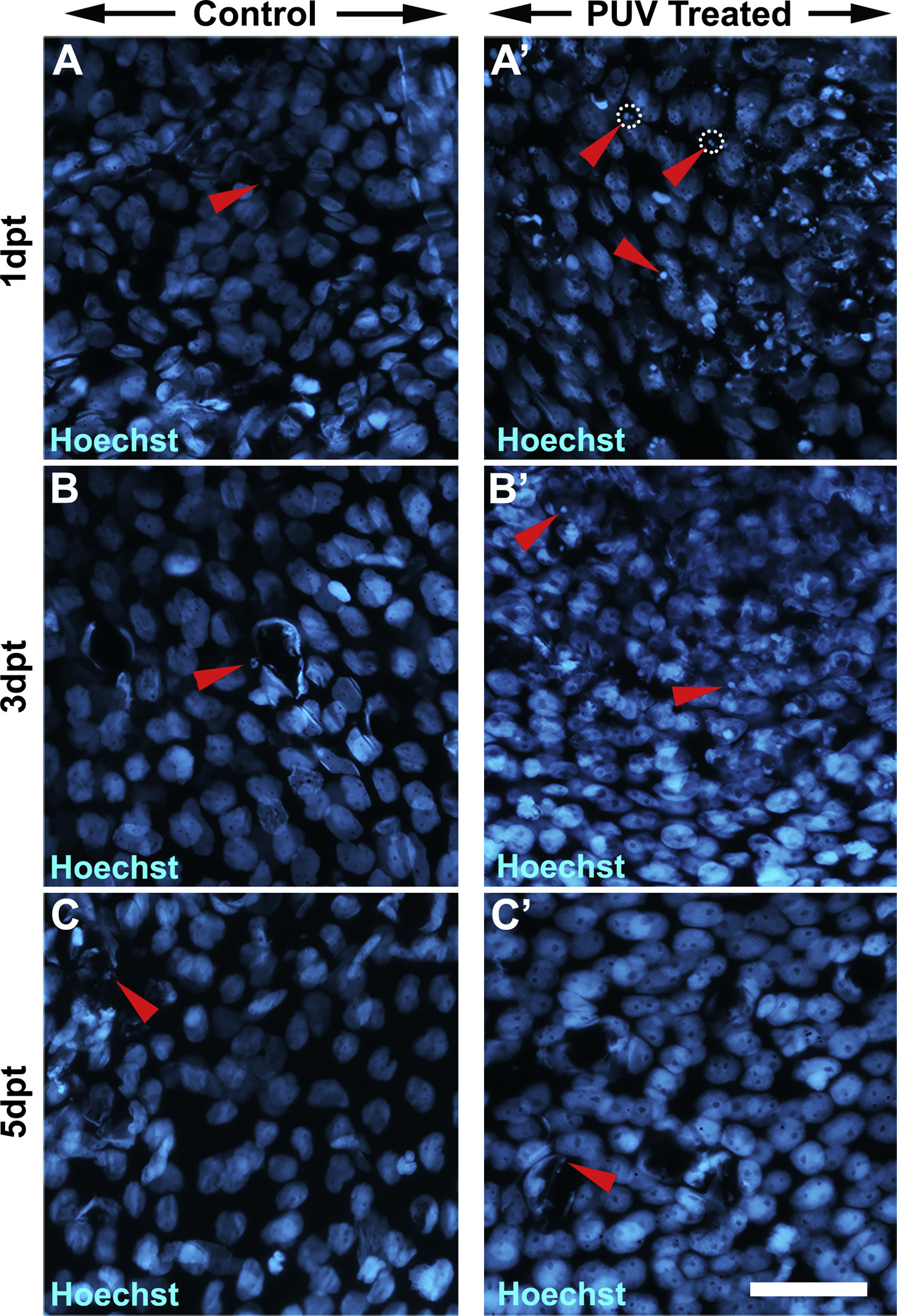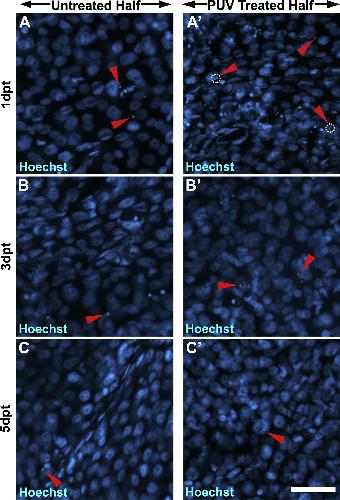 Supplementary Fig. 3. (Fig. S3): Cell death analysis via pyknotic nuclei assessment following PUV treatment on whole corneas. (supplements the data in Fig. 6A) Representative images showing Hoechst staining for 1–5 days post treatment (dpt) as labeled. (A-C) and (A′-C′) correspond to 1-5dpt for untreated control corneas and PUV treated corneas, as indicated. (A-C) Control corneas show only a minimal number of pyknotic nuclei. (A′-C′) An increase in the number of pyknotic nuclei is observed at 1 and 3dpt in PUV treated corneas, after which the number of pyknotic nuclei is similar to control corneas at 5dpt. Red arrowheads indicate representative pyknotic nuclei. White dotted circles enclose single fragmented pyknotic nuclei. Scale bar in C′ is 50 μm. |