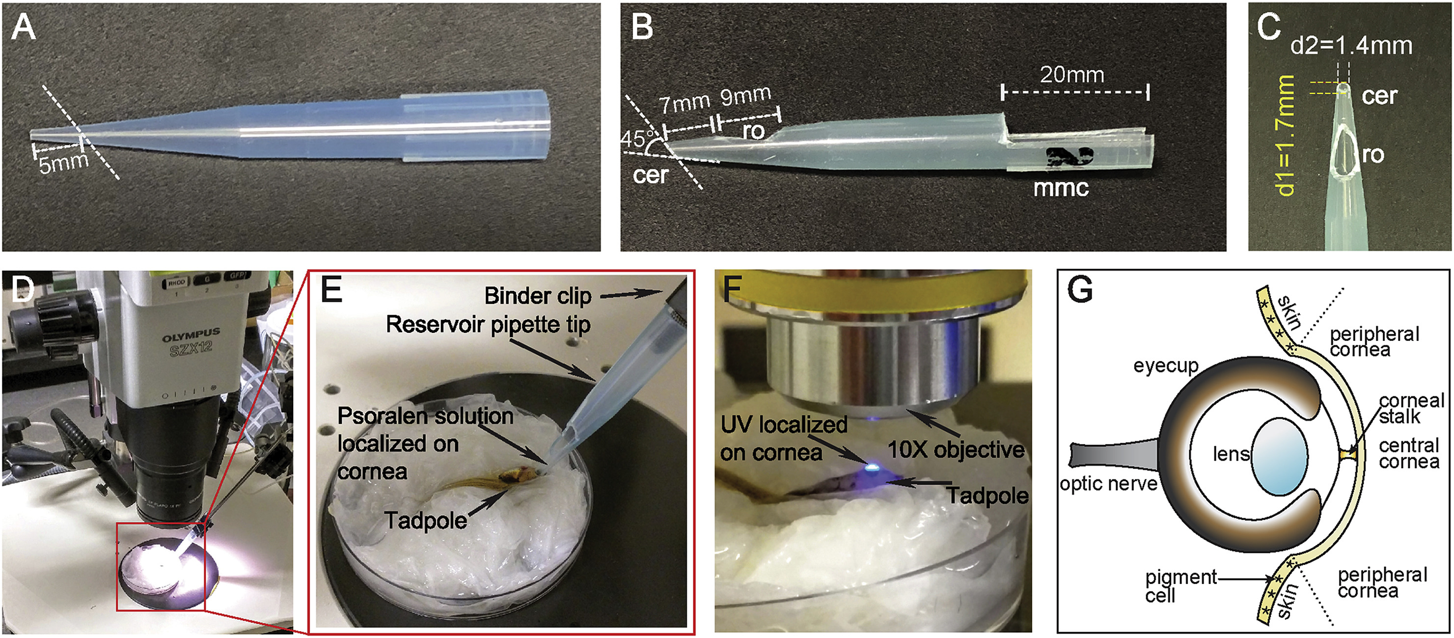 Fig. 1. Apparatus and procedure for the PUV treatment. (A) Standard 1â¯ml pipette tip, which is modified as (B) a special reservoir applicator pipette using a razor blade, according to the dimensions shown. The broad end of the pipette (mmc) is cut in half so that it can be attached to the metal rod held by the micromanipulator using a small binder clip. (C) Top view of the reservoir pipette showing the internal diameters (d1 and d2) of the pipette opening and side port or reservoir opening. (DâF) PUV-treatment procedure. (D) Anesthetized tadpole is placed in a petri dish on Kimwipes soaked in anesthetic solution. Reservoir pipette tip is affixed to a metal rod held by the micromanipulator using a small binder clip. The tip is gently placed around the cornea to form a sealed chamber. Psoralen solution is then added into the reservoir and allowed to contact the cornea. (E) Higher magnification view of area shown in panel D. (F) UV exposure using a 10X objective. UV is localized to the cornea, (bright blue spot), using the microscope iris diaphragm. (G) Schematic diagram of larval Xenopus eye. Structures are as labeled. cer, corneal end of reservoir; mmc, micromanipulator clamp end; ro, reservoir opening. (For interpretation of the references to color in this figure legend, the reader is referred to the Web version of this article.) |