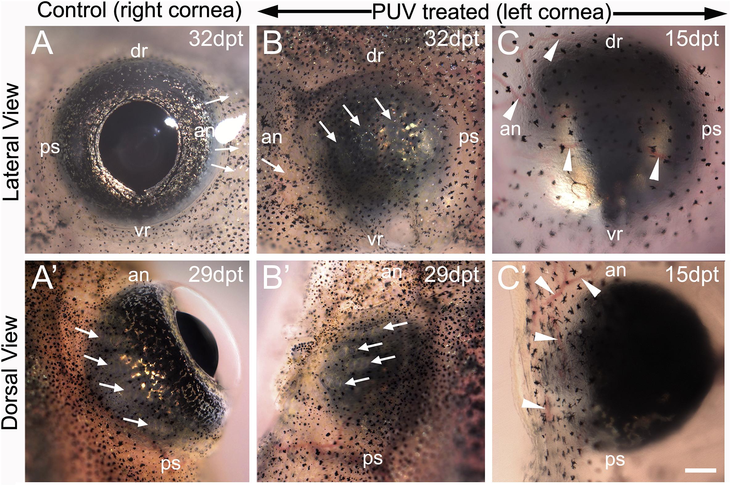Fig. 3. Severe phenotypes in whole cornea PUV treated cases. PUV treated cases showing the more severe Stem Cell Deficiency (SCD) phenotypes. (A, Aâ²) Control corneas depicting normal transparent cornea morphology. These corneas are free of vasculature, pigment cells, and the lateral line organs (white arrows) are restricted to the skin. (B, Bâ²) PUV treated cases on the opposite sides of the control corneas shown in (A, Aâ²) at 32 and 29 days post treatment, respectively, depicting the loss of the normal transparent corneal phenotype. The cornea is completely opaque and covered with epidermal tissue similar to that surrounding the eye. Skin cells, including pigment cells and the lateral line organs (white arrows), have invaded the corneal region. (C, Câ²) PUV treated cases at 15dpt, depicting vascularization with multiple blood vessels passing into the cornea (white arrowheads). an, anterior side of the tadpole; dr, dorsal side of the tadpole; ps, posterior side of the tadpole; vr, ventral side of the tadpole. Scale bar in Câ² equals 200â¯Î¼m for (C, Câ²), and 665â¯Î¼m for (A, Aâ², B, Bâ²). |
