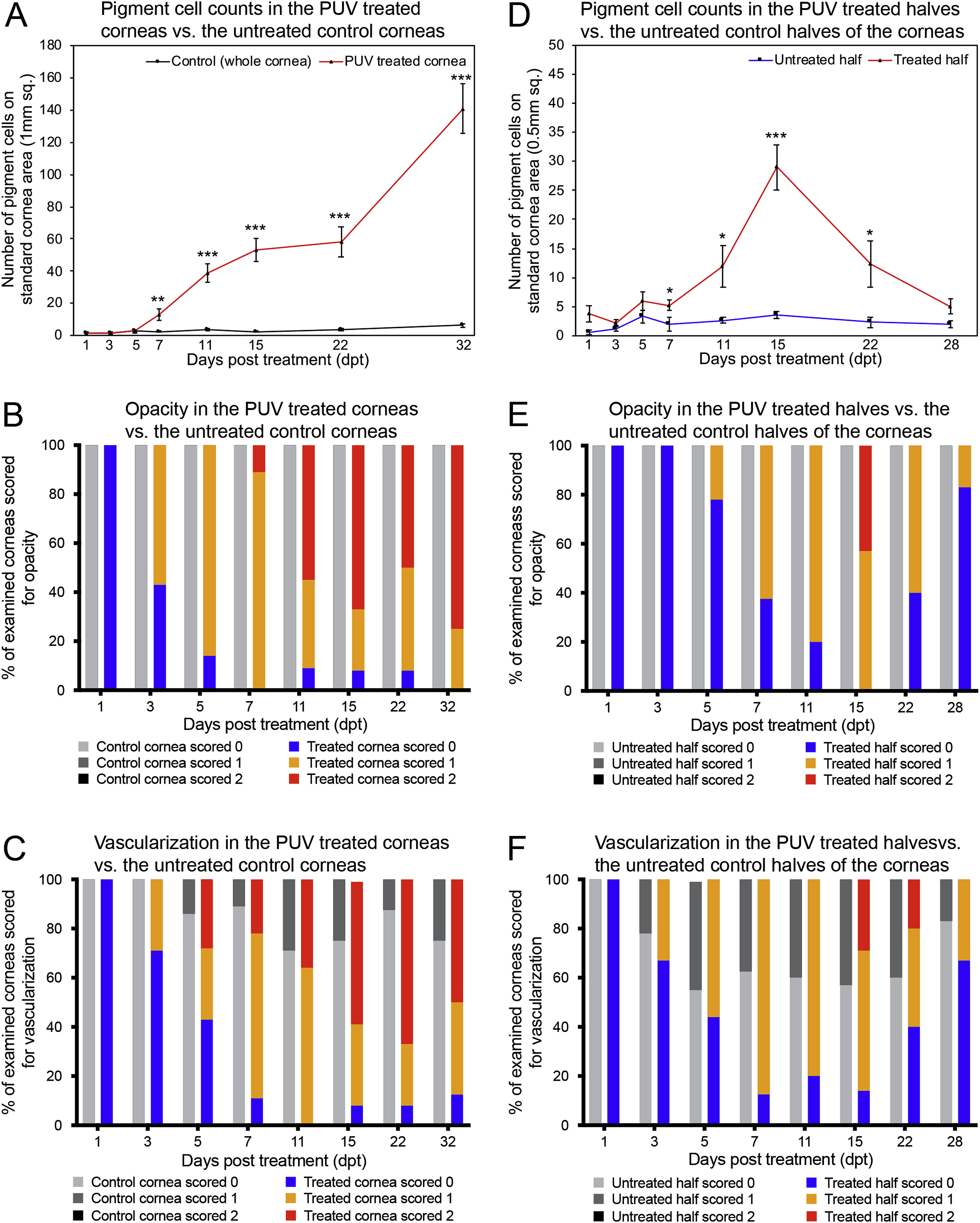 Fig. 4. Quantification of pigmentation, opacity, and vascularization following PUV treatment on whole corneas and half corneas. (A) Control corneas show very minimal levels of pigment cells (black line), whereas corneas that received PUV treatment show increased pigmentation at the corresponding time points (red line). (B) Control corneas show no opacity at all time points examined (silver columns), whereas opacity increased in PUV treated corneas as the time points progressed (orange and red columns). (C) A majority of control corneas showed no vascularization at all time points examined (silver columns), however, some corneas showed slight vascularization very close to the peripheral boundary of the cornea (gray columns). Vascularization scores in the PUV treated corneas increased as the time points progressed (orange and red columns). (D) In the cases where only half of the cornea received PUV treatment, the untreated half (blue line) shows minimal pigmentation, whereas the treated half (red line) shows an increase in pigmentation, through 15dpt, after which it starts declining as the pigment cells are lost from the cornea. (E) No corneal opacity was detected in the untreated half of the cornea (silver columns), whereas corneal opacity in the treated half of the cornea increased until 15dpt (orange and red columns), and then declined by 28dpt (blue column). (F) A majority of untreated halves of the corneas were scored 0 for vascularization at all time points examined (silver columns), however, some corneas showed slight vascularization very close to the peripheral boundary of the cornea (gray columns). Vascularization scores in the PUV treated corneas increased until 15dpt (orange and red columns), and then declined by 28dpt (blue and orange columns). Error bars represent standard error of the mean. Statistical analysis has been done for untreated control corneas vs. PUV treated corneas in (A), and for untreated control halves vs. the PUV treated halves of the corneas in (D). N = 7-12 for time points in (AâC), except for control (whole cornea) at 1dpt (N = 4). N = 5-9 for time points in (DâF). *** = p-value ⤠0.0002. ** = p-value ⤠0.008; * = p value ⤠0.05. (For interpretation of the references to color in this figure legend, the reader is referred to the Web version of this article.) |