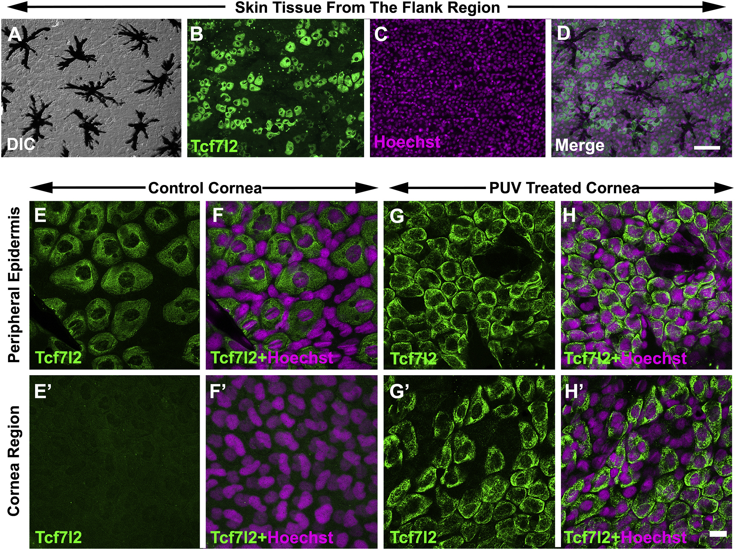 Fig. 5. Tcf7l2 immunostaining showing appearance of Tcf7l2 expressing skin cells in the cornea region following whole cornea PUV treatments. (AâD) Normal skin tissue obtained from the flank region of a representative tadpole. (A) DIC image showing pigment cells, which are a characteristic of skin tissue. (B) Skin tissue shows positive immunostaining for Tcf7l2, which labels a subset of apical epithelial skin cells that are not normally present in the cornea. (C, D) are the corresponding Hoechst and merged images for (A, B), respectively. (E-Hâ²) Control and PUV treated corneas obtained from the left and right sides of the same tadpole, respectively. (E, F) shows the peripheral epidermis region (skin that surrounds the cornea), where Tcf7l2 staining is normally observed. (Eâ², Fâ²) shows the cornea region of the control (untreated) cornea, where no Tcf7l2 staining is normally observed. (G, H) is the peripheral skin region, and (Gâ², Hâ²) is the cornea region overlying the eye and of a PUV treated cornea collected at 12dpt. The presence of Tcf7l2 expressing cells in the cornea region shows the presence of these skin cells. Note that these Tcf7l2 positive cells appear smaller and more compacted than those found in the surrounding skin. (F, Fâ², H, Hâ²) are the corresponding merged (Tcf7l2+Hoechst) images of (E, Eâ², G, Gâ²), respectively. Scale bar in D equals 100 μm and applies to A-D and equals 40 μm in Hâ² and applies to E-Hâ. |