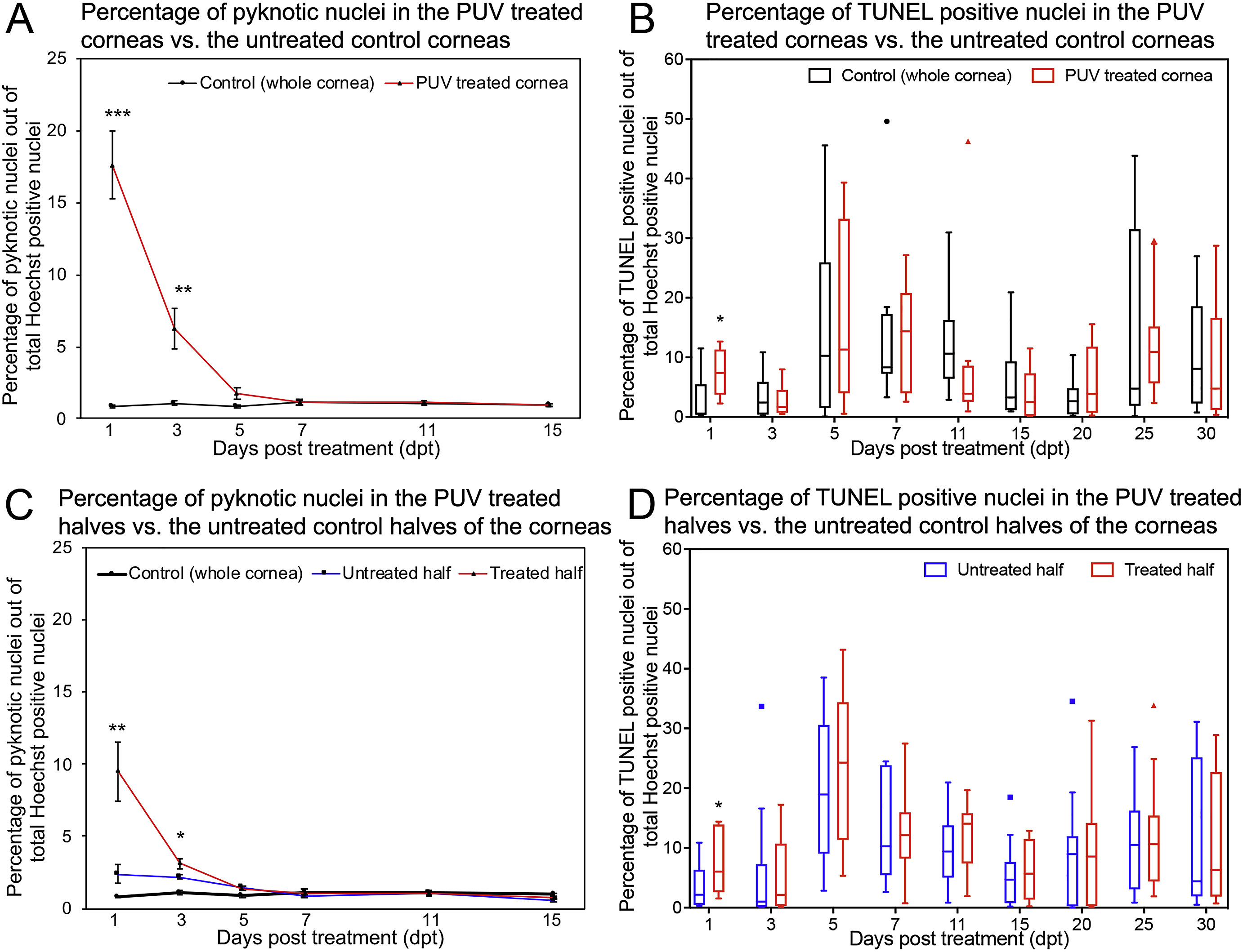 Fig. 6. Quantification of pyknotic nuclei and apoptotic cell death following PUV treatment on whole corneas and half corneas. (A, B) Counts of pyknotic nuclei and TUNEL positive nuclei, respectively, in the untreated controls (whole cornea) (black line) and the PUV treated whole corneas (red line). (C, D) Counts of pyknotic nuclei and TUNEL positive nuclei, respectively, in the untreated (control) halves (blue line) vs. the PUV treated halves of the corneas (red line) of the same corneas. Control (whole cornea) from (A) has been included in (C) for convenience of comparison (black line). The observations have been taken at the time points indicated on the X-axis (dpt). The pyknotic nuclei and TUNEL positive nuclei are represented as a percentage of the total Hoechst nuclei. (A, C) Error bars represent standard error of the mean. (B, D) Boxes represent lower and upper quartiles; whiskers and outliers represent Tukey range. Statistical analysis has been done for untreated control corneas (black) vs. PUV treated corneas (red) in (A, B), and for untreated control halves (blue) vs. the PUV treated halves (red) of the corneas in (C, D). Outliers have been included in calculating p-values in (B, D). N = 9 for all time points in (A). N = 9-13 for time points in (B). N = 10 for all time points in (C). N = 10-15 for time points in (D). *** = p ≤ 0.001; ** = p ≤ 0.01; * = p ≤ 0.05. (For interpretation of the references to color in this figure legend, the reader is referred to the Web version of this article.) |
