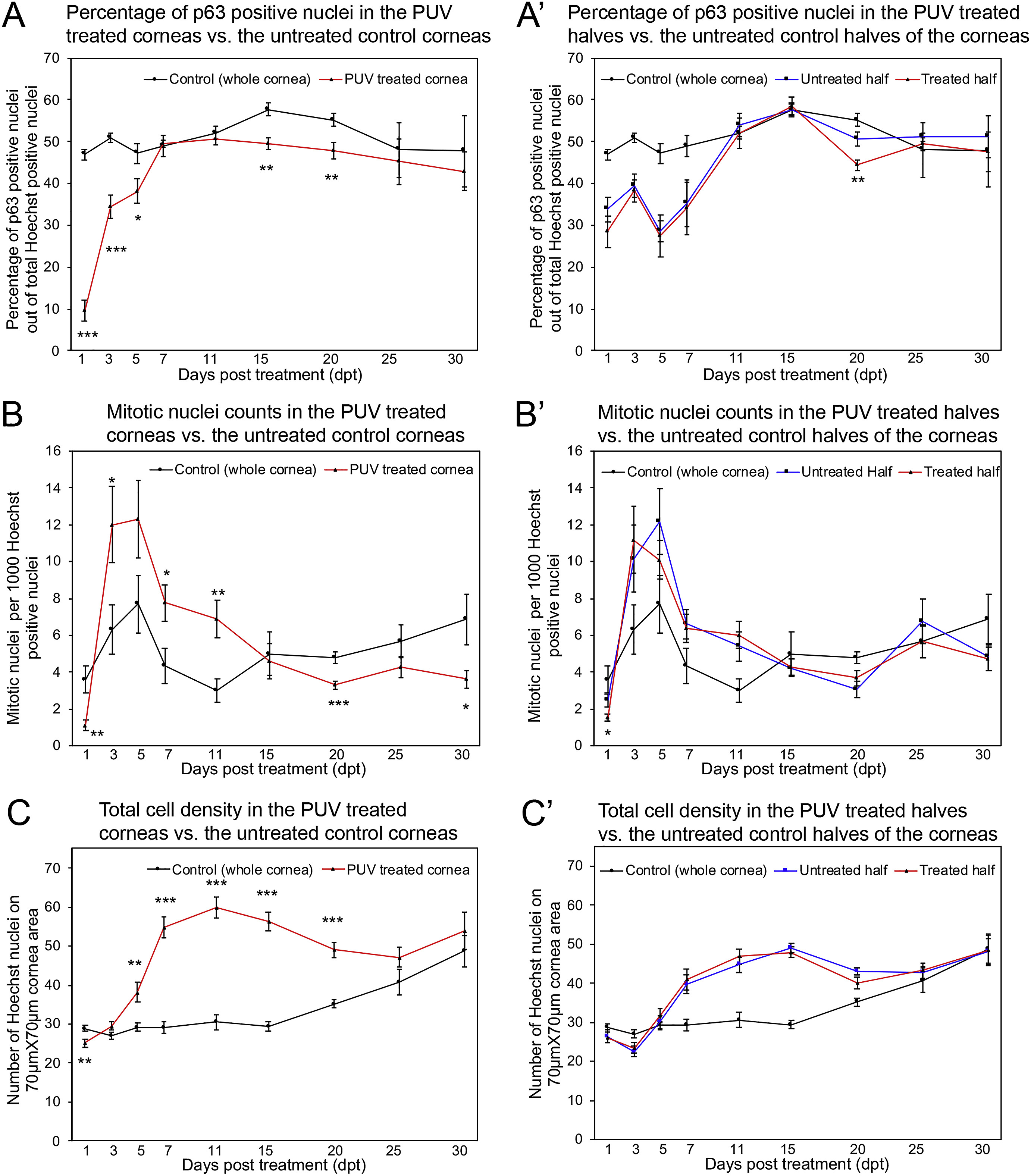 Fig. 7. Quantification of p63 positive nuclei, mitosis, and total cell density following PUV treatment on whole corneas and half corneas. (AâC) Percentage of p63 positive nuclei, mitotic nuclei counts (H3S10), and total cell density, respectively, in the untreated controls (whole cornea) (black lines) vs. the PUV treated whole corneas (red lines). (Aâ²-Câ²) Percentage of p63 positive nuclei, mitotic nuclei counts (H3S10), and total cell density in the untreated control half (blue lines) vs. the PUV treated half (red lines) of the cornea. The controls (whole cornea) from (AâC) have been included in (Aâ²-Câ²), respectively, for convenience of comparison (black lines). The observations have been taken at the time points indicated on the X-axis, as days post treatment (dpt). Error bars indicate standard error of the mean. Statistical analysis has been done for untreated control corneas (black lines) vs. PUV treated corneas (red lines) in (AâC), and for untreated control halves (blue lines) vs. the PUV treated halves (red lines) of the corneas in (Aâ²-Câ²). N = 7-10 for time points in (A). N = 10-15 for time points in (Aâ²). N = 7-13 for time points in (B). N = 9-15 for time points in (Bâ²). N = 9-13 for time points in (C). N = 10-15 for time points in (Câ²). *** = p ⤠0.001; ** = p ⤠0.01; * = p ⤠0.05. (For interpretation of the references to color in this figure legend, the reader is referred to the Web version of this article.) |