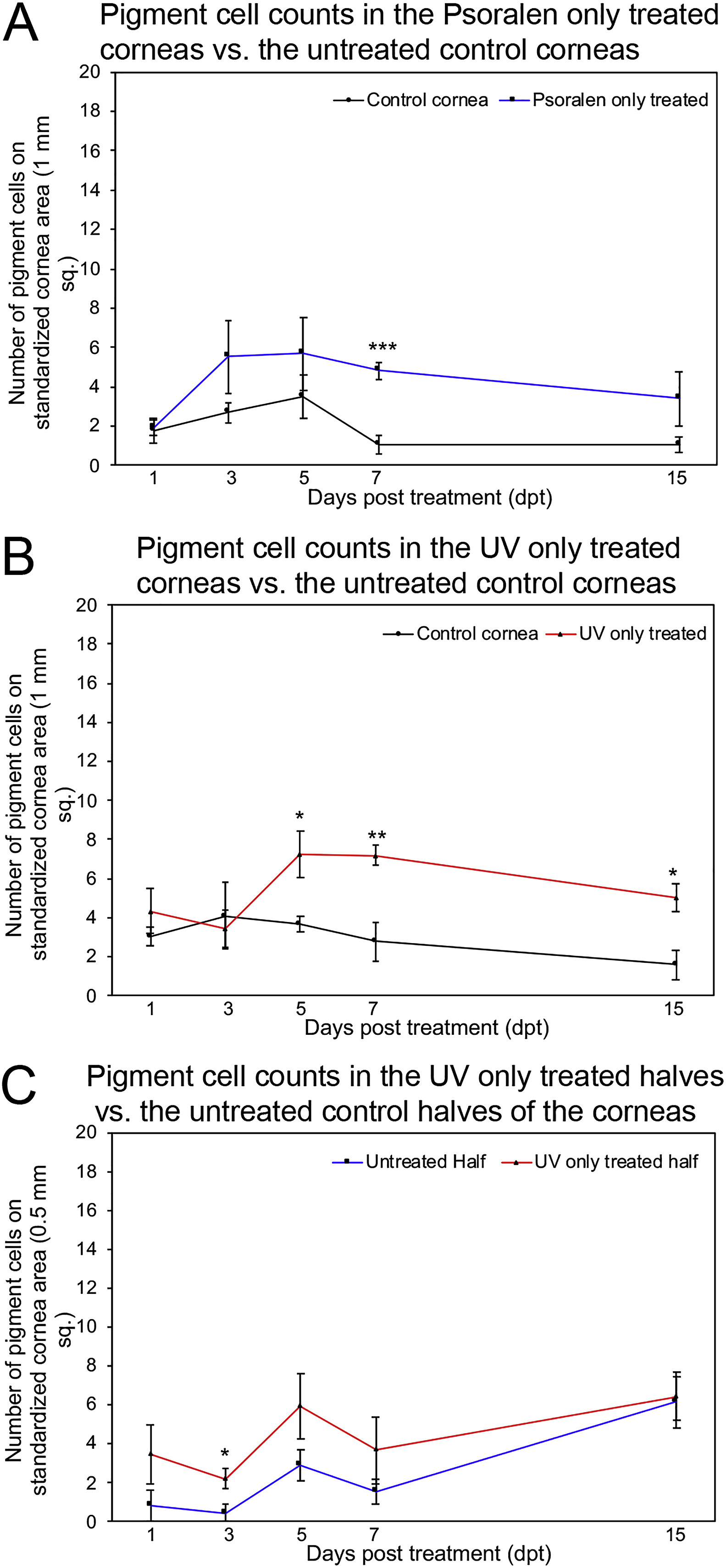 Fig. 8. Quantification of pigmentation in Psoralen only (whole cornea), UV only (whole cornea), and UV only (half cornea) controls. (A) The contralateral control corneas (black line) show a minimal level of pigmentation. Only slightly elevated levels of pigmentation were observed in Psoralen only whole cornea treatment controls (blue line). A significant increase was only observed at 7dpt. (B) When compared to the contralateral untreated corneas (black line), UV only treatment on whole corneas (red line) appears to cause a significant increase in the levels of pigmentation at 5, 7, and 15dpt. However, pigmentation was still minimal in the UV only treated controls at these time points. (C) In the cases where only half of the cornea received UV treatment, the treated halves (red line) show minimal increases in pigmentation at 1-7dpt. Error bars indicate standard error of the mean. Statistical analysis has been done for control cornea vs. Psoralen only treated (A), control cornea vs. UV only treated (B), and untreated halves vs. the UV only treated halves of the corneas (C). N = 4 for all time points in (AâC). *** = p ⤠0.001; ** = p ⤠0.01; * = p ⤠0.05. (For interpretation of the references to color in this figure legend, the reader is referred to the Web version of this article.) |