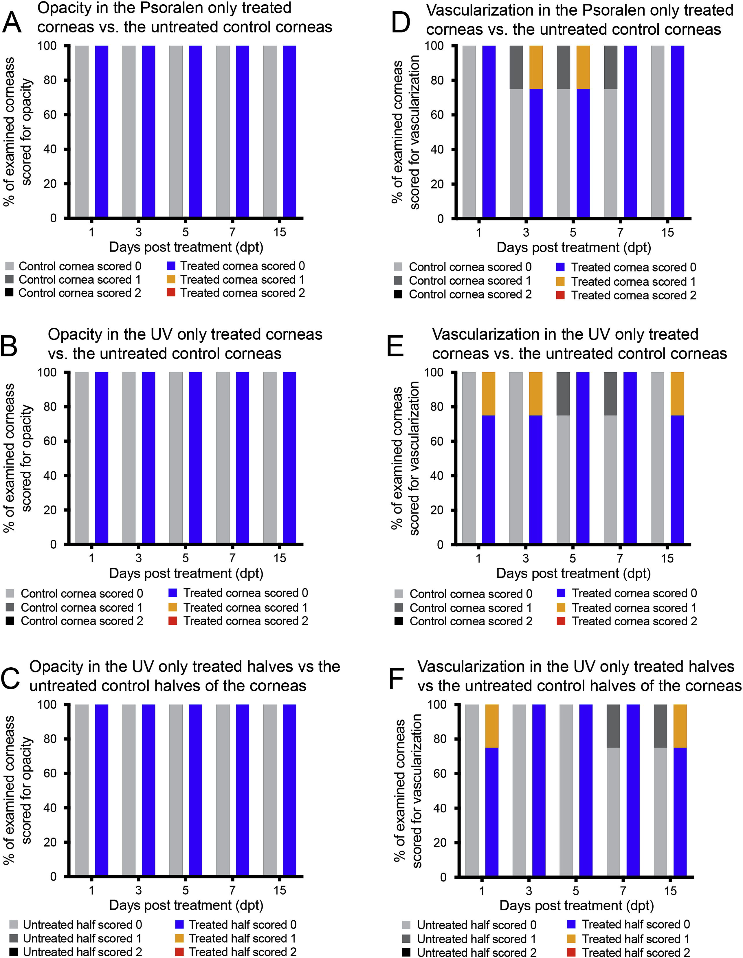 Fig. 9. Opacity and vascularization in Psoralen only (whole cornea), UV only (whole cornea), and UV only (half cornea) controls. Stacked column graphs of corneal opacity and vascularization are shown. For each time point examined, the analysis has been done for the Psoralen only treated control corneas vs. their contralateral corneas (A, D), respectively, the UV only treated control corneas vs. their contralateral corneas (B, E), respectively, and the untreated half vs. the treated half of the UV only half treated control corneas (C, F), respectively. None of the controls showed any signs of opacity at any of the time points examined (silver and blue columns in A, B, E). Whereas a majority of control specimens showed no signs of vascularization (silver and blue columns in D, E, F), some control specimens showed slight vascularization very close to the peripheral boundary of the cornea (gray and orange columns in D, E, F), however, these vessels never extended into the central cornea region. (For interpretation of the references to color in this figure legend, the reader is referred to the Web version of this article.) |