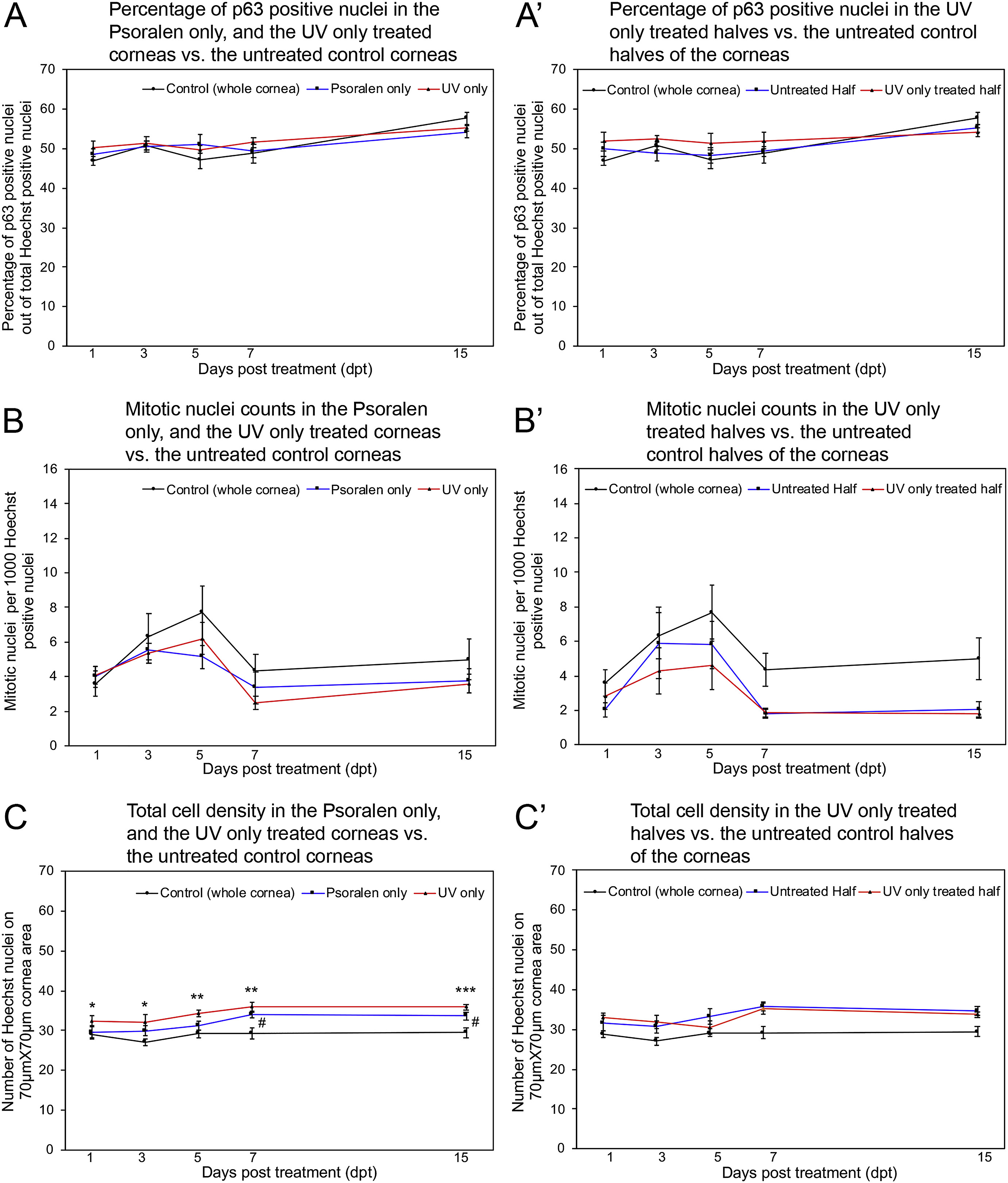 Fig. 11. Quantification of p63 positive nuclei, mitosis, and total cell density in Psoralen only (whole cornea), UV only (whole cornea), and UV only (half cornea) controls. At each time point observed, the percentage of p63 positive nuclei (A), and mitotic nuclei counts (B) were similar among the untreated controls (black line), Psoralen only controls (blue line), and UV only controls (red line), respectively. (C) Compared to the untreated controls (black line), the total cell density is significantly higher at 7 and 15dpt in Psoralen only controls (blue line), and significantly higher at all time points in UV only controls (red line). Percentage of p63 positive nuclei (Aâ²), mitotic nuclei counts (Bâ²), and total cell density (Câ²) in both the untreated (blue line) and treated (red line) halves of the UV only treated half cornea controls show similar levels, respectively. The controls (whole cornea) from (AâC) have been included in (Aâ²-Câ²), respectively, for convenience of comparison. Error bars indicate standard error of the mean. Statistical analysis has been done for controls (whole cornea) vs. Psoralen only treated, and controls (whole cornea) vs. UV only treated in (AâC), and untreated halves vs. the UV only treated halves of the corneas in (Aâ²-Câ²). N = 6-7 for Psoralen only treated, UV only treated, and UV only half treated at all time points in (A-C, Aâ²-Câ²). N = 9 for controls (whole cornea) for all time points in (A, C, Aâ², Câ²). N = 7-9 for controls (whole cornea) for time points in (B, Bâ²). *** = p ⤠0.001; ** = p ⤠0.01; * = p ⤠0.05 (for UV only vs. controls (whole cornea)). # = p ⤠0.05 (for Psoralen only vs. controls (whole cornea)). (For interpretation of the references to color in this figure legend, the reader is referred to the Web version of this article.) |