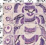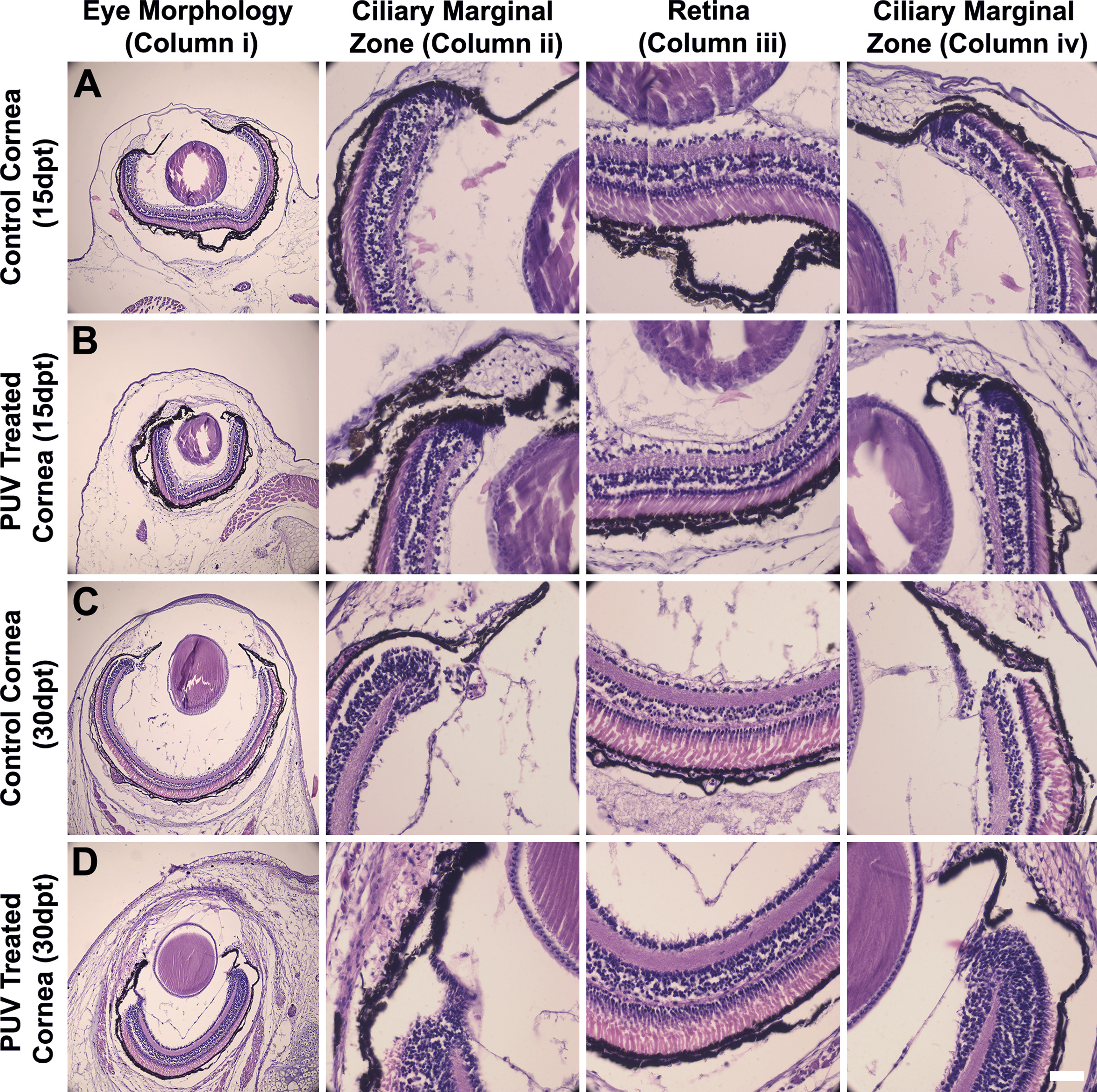 Supplementary Fig. 2. (Fig. S2): Histological examination of eye tissue morphology. (supplements data in Fig. 2A, C, 2D, 2Aâ², 2Câ², 2Dâ²) Representative images of Hematoxylin and Eosin stained eye cross sections are shown (Column i), along with the higher magnification images of their retina (Column iii) and ciliary marginal zones (Column ii and Column iv). (A, B) The untreated control and the PUV treated corneas, respectively, at 15 days post treatment (dpt). (C, D) The untreated control and the PUV treated cornea at 30dpt. No differences were observed in overall eye morphology between the untreated control and the PUV treated corneas, which includes the tissues of the retina and ciliary marginal zones. Scale bar in D column iv equals 50â¯Î¼m for images in Column ii â Column iv, and 200â¯Î¼m for images in Column i. |
