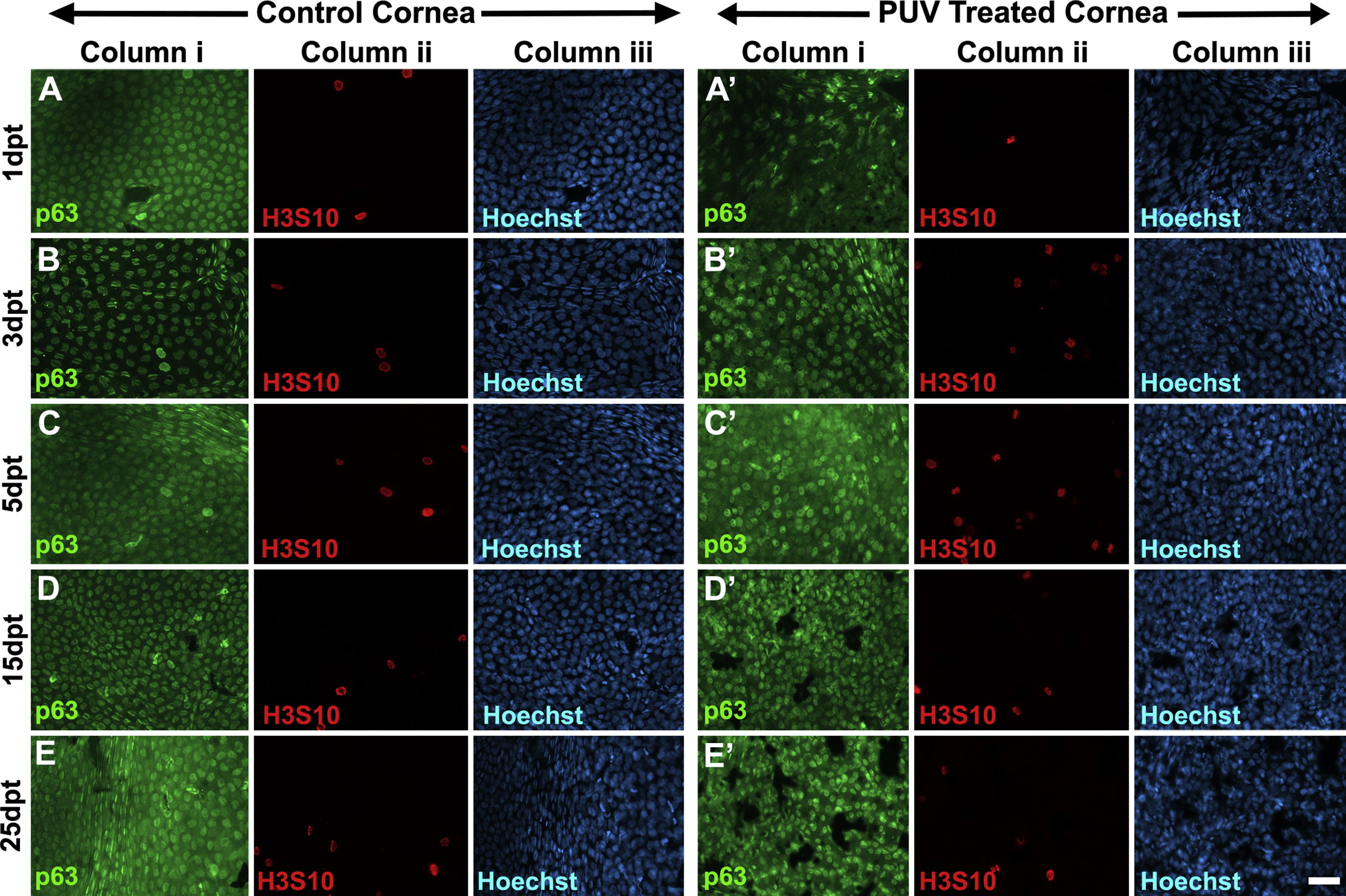 Supplementary Fig. 8. (Fig. S8): Percentage of p63 positive nuclei, mitotic nuclei, and total cell density following PUV treatment on half corneas. (supplements the data in Fig. 7Aâ-7Câ²) Representative images of p63 positive nuclei are shown in the green fluorescence channel (Column i), mitotic nuclei (H3S10) are shown in the red fluorescence channel (Column ii), alongside corresponding Hoechst counterstain in the blue (UV) fluorescence channel (Column iii), for the time points indicated as days post treatment (dpt). (A-E) and (Aâ²-Eâ²) correspond to 1, 3, 5, 15, 25dpt for untreated control half of the corneas and the PUV treated half of the corneas, as indicated. PUV treatment reduced the percentage of p63 nuclei at 1dpt in both the halves, which recovered at 15 and 25dpt. The treated half of the cornea initially showed a decrease in mitosis compared to the untreated half at 1dpt. Similar levels of mitosis were observed between the treated and untreated halves for 3, 5, 15, 25dpt, where both the halves showed an increase in mitosis at 3, 5, 25dpt. The total cell density in the treated half of the cornea, appeared similar to the untreated halves of these corneas for the respective time points, and showed an increase starting at 5dpt. Scale bar in Eâ² column iii is 50â¯Î¼ |