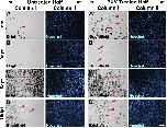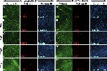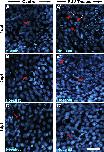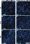 Supplementary Fig. 5. (Fig. S5): Percentage of p63 positive nuclei, mitotic nuclei, and total cell density following PUV treatment on whole corneas. (supplements the data in Fig. 7AâC) Representative images of p63 positive nuclei are shown in the green fluorescence channel (Column i), mitotic nuclei (H3S10) are shown in the red fluorescence channel (Column ii), alongside corresponding Hoechst counterstain in the blue (UV) fluorescence channel (Column iii), for the time points indicated as days post treatment (dpt). (A-E) and (Aâ²-Eâ²) correspond to 1, 3, 5, 15, 25dpt for untreated control corneas and PUV treated corneas, as indicated. Percentage of p63 remains fairly consistent in untreated control corneas. PUV treatment reduced the percentage of p63 nuclei at 1dpt, and the nuclei appear damaged. The mitotic nuclei counts were decreased at 1dpt in PUV treated corneas, while an increase was observed in mitosis at 3 and 5dpt in the PUV treated corneas. After the initial increase, the mitotic counts declined at 15dpt to control levels, and remained lower than the mitotic counts in untreated control corneas at 25dpt. Total cell density remains fairly consistent from 1 to 15dpt in untreated control corneas, and an increase in the total cell density was observed at 25dpt. Total cell density decreased at 1dpt in PUV treated corneas, while increased total cell density was observed at 3, 5, 15, 25dpt. Scale bar in Eâ² column iii is 50â¯Î¼m. |