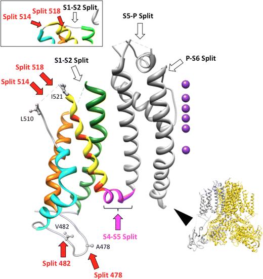 Fig. 1 Tridimensional structure of a Kv11.1 subunit transmembrane core region and position of the split points at the different extra and intracellular loops linking the transmembrane segments. A lateral view of the Kv11.1 tetrameric structure ([65]; PDB code 5VA2) with the subunit corresponding to the enhanced view in the main panel highlighted in gray, is shown on the lower right. The region coloured in gray in the central panel corresponds to the pore domain including the S5 and S6 helices. The S4âS45 linker is in magenta. Ribbons from the S4, S3, S2 and S1 segments are in yellow, cyan, brown and green, respectively. The position of the residues providing the positive charges to the S4 helix is marked in orange. Lateral chains of residues 478 and 482 at which the S2âS3 linker was sectioned in this study, and 510 and 521 that mark the boundaries of the structurally undefined S3âS4 linker are shown as ball and stick. The location of the different split points described in this study are indicated, with those that did not yield functional expression marked with open arrows and those giving rise to functional channels marked with solid arrows. A view of the extracellular and structurally defined S1âS2 and S3âS4 linkers region from the homologous Kv10.1 channel ([67]; PDB code 5K7L) is depicted in the upper inset, showing the corresponding position of the Kv11.1514 and 518 splits. Structures were processed with UCSF Chimera [41] |