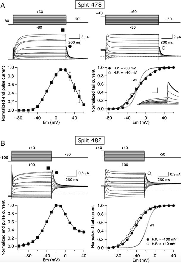 Fig. 2 Characterization of activation gating voltage dependence of S2âS3 linker splits. a Split 478. Representative membrane currents from individual oocytes submitted to 1 s depolarization pulses to different potentials at 10 mV intervals from a negative (ââ80 mV, left) and a positive (+â40 mV, right), followed by a repolarization step to ââ50 mV. Currents recorded without leak subtraction are shown. Averaged I vs V relationships measured at the end of the depolarization step (signalled by the solid square at the top) and at the peak of the tail current (G/V plots, circles) are shown at the bottom. Continuous lines in the G/V plots are Boltzmann fits to the data as indicated in âMaterials and methodsâ. A G/V plot from continuous wild-type channels (WT, dashed line) is also shown for comparison. A family of wild-type channel currents in response to 1-s depolarizing pulses from ââ80 to +â40 mV, followed by a repolarization to ââ70 mV, is shown in the inset. In this case, the horizontal and vertical scale bars correspond to 200 ms and 500 nA, respectively. b Split 482. Recording of currents in response to the protocols shown on top of the traces and analysis were performed as detailed in A |
