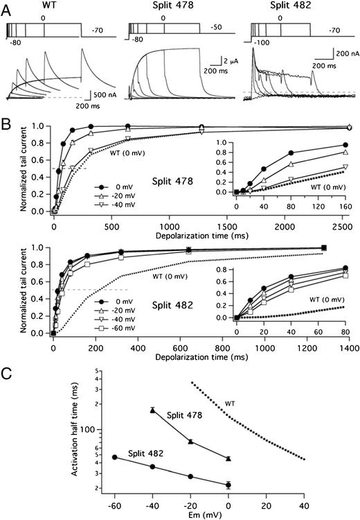 Fig. 3 Characterization of voltage-dependent activation rates of S2âS3 linker splits. a Time course of current activation at 0 mV. Families of representative membrane currents from individual oocytes are shown. The duration of a depolarizing prepulse to 0 mV was varied as illustrated in the envelope-of-tail-currents protocol at the top, followed by a repolarization step to the indicated potentials. Cells expressing wild-type and split 478 channels were held at ââ80 mV and those expressing split 482 channels at ââ100 mV to ensure that they always started in a deactivated state. b Averaged plots of normalized tail current magnitudes vs depolarization time at different potentials. Most error bars are smaller than the symbols. Values from continuous wild-type channels at 0 mV are shown as a dotted line for comparison. Expansions of the initial tens of ms to highlight the early current delay in the sigmoidal activation time courses are shown in the insets. c Comparison of activation rate voltage-dependence. Plots of normalized tail current magnitudes vs depolarization times (a) were used to measure times necessary to attain half-maximum current magnitudes, that are plotted vs depolarization potential. Values from continuous wild-type channels (WT) are shown as a dotted line for comparison |