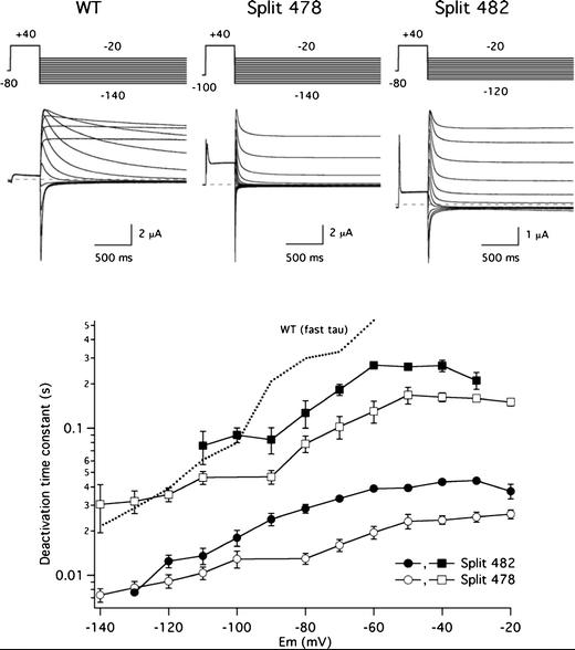 Fig. 4 Effect of S2âS3 linker splits on Kv11.1 voltage-dependent deactivation kinetics. Representative families of currents are shown at the top, obtained during steps to potentials ranging from ââ20 to ââ140 mV in 10-mV intervals, following depolarization pulses at +â40 mV to open (and inactivate) the channels, using the indicated protocol. For clarity, only the first part of the 4-s repolarization steps used to follow the complete decay of the tail currents is shown. The dependence of deactivation rates on repolarization membrane potential is shown at the bottom. Deactivation time constants were quantified by fitting a double exponential to the decaying portion of the tails as described in âMaterials and methodsâ. Fast (circles) and slow (squares) deactivation time constants are depicted in the plot. Data corresponding to the fast decaying component from continuous wild-type channels (WT) are shown as a dotted line for comparison |