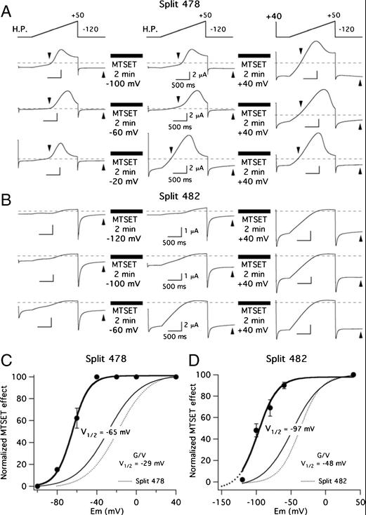 Fig. 5 Effect of S2âS3 linker interruptions on voltage dependence of MTSET availability to an engineered cysteine at position 521 in the extracellular part of the voltage sensor S4 helix. a, b Absence of MTSET effects in cells held at negative potentials not submitted to repetitive depolarization pulsing, and determination of the voltage range at which the MTS reagent induces its effects under steady-state conditions. Current traces obtained in response to the indicated voltage protocols are shown for 478 (a) and 482 (b) splits. No pulses were applied during the 2-min periods indicated by black boxes at which the cells were continuously held at the indicated potential. A high K+ extracellular solution was used to maximize the currents due to the small current magnitudes obtained with the Split 482 construct (see âMaterials and methodsâ). Arrowheads are used to indicate the time at which the current variations were estimated quantifying either the magnitude of the final versus peak current during the voltage steps following the ramp pulses or the rectification factor during the ramps as indicated in Methods. Similar results were obtained in both cases. c, d Voltage dependence of the MTSET effect. Magnitudes of MTSET-induced variations in currents measured (b), following a 2-min exposure to 1 mM of MTS reagent without pulsing at the holding potentials indicated in the abscissa were normalized to those observed at a positive potential value of +â40 mV. Due to the irreversibility of the MTSET effects, only one reagent application was performed and a single holding potential value (followed by a positive control at +â40 mV) was checked in each cell studied. Data from three to six cells were averaged for every single point. Some error bars are smaller than the symbols. Continuous lines linking the data points correspond to fits using a Boltzmann function as indicated in âMaterials and methodsâ. The corresponding V1/2 values are shown on the graphs. G/V plots from the same constructs obtained from fits to tail current data and V1/2 values derived from them are also shown as indicated. Note the similarity of these plots and those from the same splits without the mutations I521C, C445V and C449V (dotted lines; reproduced from split channels curves in Fig. 2) introduced to study the MTSET-induced effects (see âMaterials and methodsâ section) |