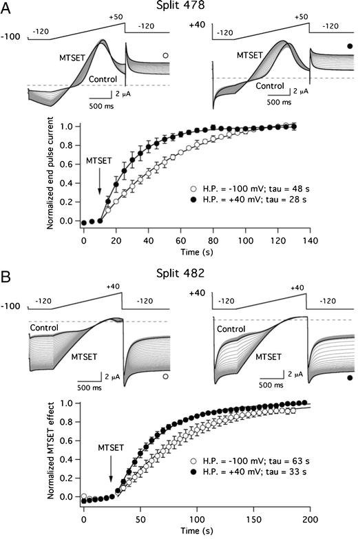 Fig. 6 Effect of S2–S3 linker interruptions on MTSET-induced modification rates of engineered cysteine 521. a Split 478. Current traces shown at the top were obtained in response to the indicated protocol that was repeated at 5-s intervals. Current traces corresponding to times immediately before application of 1 mM MTSET and at the end of the MTSET exposure using hyperpolarizing (− 100 mV) and depolarizing (+ 40 mV) holding potentials are highlighted as thicker black lines. The bottom plot illustrates the time course of MTSET-induced modifications normalized to those observed at the end of the treatment. The changes in the peak/end current relationship during the − 120 mV voltage step were used to generate the plot. Mono-exponential fits to the data are shown superimposed on the symbols. The values of the corresponding time constants (tau) are indicated in the graphs. b Split 482. Plots represent the representative currents and time course of MTSET-induced modifications as detailed (a). A high K+ extracellular solution was used with the Split 482 construct |