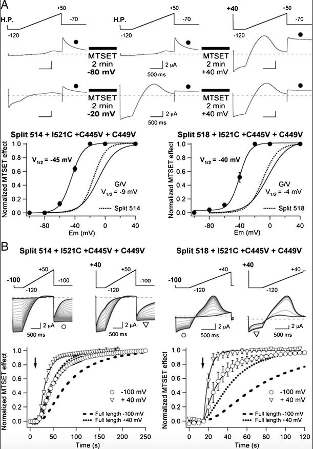 Fig. 8 Effect of S3âS4 linker interruptions on MTSET availability to an engineered cysteine at position 521 in the extracellular part of the voltage sensor S4 helix. a Steady-state voltage dependence of MTSET effects. Representative current traces from two oocytes expressing 514 split channels held at the indicated potentials and not submitted to repetitive depolarization pulsing are illustrated at the top. No pulses were applied during the 2-min periods indicated by black boxes at which the cells were continuously held at the indicated potential. Measurements of current variations at the end of the repolarizing step (circles) were used to determine the voltage range at which the MTS reagent induces its effects under steady-state conditions as shown at the bottom. Plots obtained from split 514 (bottom left) and split 518 channels (bottom right) are shown. Continuous lines linking the data points correspond to fits using a Boltzmann function as indicated in âMaterials and methodsâ. The corresponding V1/2 values are shown on the graphs. G/V plots from the same constructs obtained from fits to tail current data and V1/2 values derived from them are also shown. Note the similarity of these plots and those from the same splits without the mutations I521C, C445V and C449V (dotted lines; reproduced from Fig. 7a). bMTSET-induced modification rates of cysteine 521. Current traces shown at the top were obtained in response to the indicated protocols that were repeated at 5-s intervals. Data from 514 (left) and split 518 channels (right) held at ââ100 and +â40 mV are shown as indicated. A high K+ extracellular solution was used to maximize the currents of the Split 514 construct. Current traces corresponding to times immediately before application of 1 mM MTSET and at the end of the MTSET exposure are highlighted as thicker black lines. Plots of the time course of MTSET-induced modifications normalized to those observed at the end of the treatment are depicted at the bottom. The changes in the peak/end current relationship during the ââ120 mV voltage steps were used to generate the plots. The time of MTSET introduction into the recording chamber is marked with an arrow. Mono-exponential fits to the data are shown superimposed to the symbols. Data from I521C full-length continuous channels at ââ100 and +â40 mV are shown for a better comparison as dashed and dotted lines, respectively. Note the different time scale of the split 514 and split 518 plots in the abscissa |