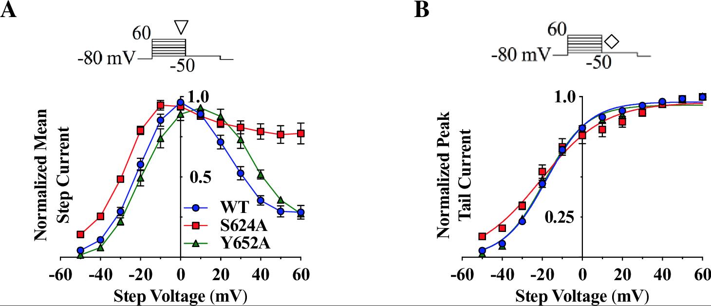 Fig 3. Comparison of unaffected step and tail currents from WT hERG, S624A, and Y652A hERG mutants. A) Step I-V curves for WT (â, blue), S624A (â¡, red), and Y652A (â³, green) from a step depolarization protocol (top; currents measured at â½). Rectification of S624A currents was reduced in comparison to WT current, with more than twice the amount of normalized current remaining for S624A (0.77 ± 0.06) compared to WT (0.28 ± 0.04) at +60 mV. B) WT, S624A, and Y652A tail I-V curves from a step depolarization protocol (top; currents measured at â). Boltzmann fits generated the following V0.5 of activation (neither of which were different from WT; p > 0.8 for WT-mutant comparisons): WT V0.5 = -16.5 ± 1.1 mV, S624A V0.5 = -17.7 ± 3.2 mV, and Y652A V0.5 = -16.5 ± 1.0 mV. The slopes for the activation curves were 11.7 ± 0.45 for WT, 16.3 ± 1.62 for S624A (p = 0.0033 compared to WT), and 12.5 ± 0.84 for Y652A (p = 0.7913 compared to WT); nWT = 14, nS624A = 9, nY652A = 9, one-way ANOVAs. |