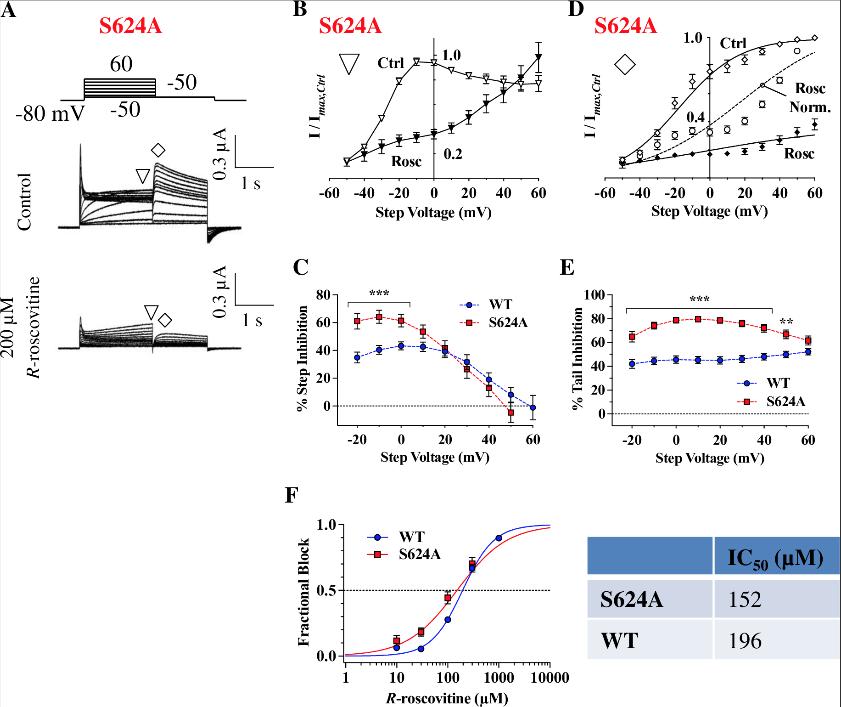 Fig 4. S624A hERG channels have an increased sensitivity to R-roscovitine. A) Voltage protocol and representative current traces, from a cell expressing S624A hERG, before and during 200 μM R-roscovitine application. Note that tail currents were greatly diminished upon R-roscovitine application. B) S624A step I-V curves before and during 200 μM R-roscovitine application (currents measured at â½ in A). The strongest inhibition occurred between -30 mV and +30 mV. C) Percent step inhibition of WT and S624A at varying step voltages. S624A was inhibited more potently than WT at intermediate voltages, where open probability is high (p < 0.05 for WT vs. S624A between -20 mV and 0 mV, nWT = 14, nS624A = 9, one-way ANOVA). D) S624A tail I-V curves measured at â. Smooth lines are Boltzmann fits that generated V0.5 of activation in Control: -17.7 ± 3.2 mV and in R-roscovitine: -3.3 ± 6.1 mV; ns, p = 0.09. The slopes were 16.3 ± 1.6 in Control, and 44.5 ± 3.3 in R-roscovitine (p < 0.0001; n = 9, paired t-tests). Dashed line indicates the fit to normalized currents in R-roscovitine. E) Percent tail inhibition of WT and S624A. When compared to WT over a range of voltages, levels of S624A tail current inhibition were much larger (p < 0.05 for WT vs. S624A between -20 mV and +50 mV, nWT = 14, nS624A = 9, one-way ANOVA). F) Concentration-response relationship for S624A. The S624A IC50 (152 ± 22 μM) was not significantly lower than the WT IC50 (196 ± 12 μM;p = 0.8323 for WT vs. S624A) but the dose-response slope for S624A was statistically smaller (0.84 ± 0.08 vs 1.5 ± 0.1 for WT; p = 0.0003, nWT = 11, nS624A = 9, one-way ANOVA). ** = P < 0.01, and *** = P < 0.001. |