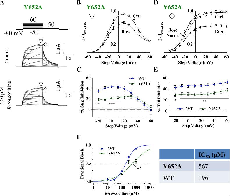 Fig 5. The Y652A mutation attenuates hERG inhibition by R-roscovitine. A) Voltage protocol and representative current traces of a cell expressing Y652A hERG before and during 200 μM R-roscovitine application. B) Y652A step I-V curves before and during 200 μM R-roscovitine inhibition (currents measured at â½). The curves were bell-shaped and displayed inhibition at intermediate voltages. C) Percent step inhibition of WT currents were much stronger than that of Y652A between -20 mV and +10 mV (p < 0.05 for WT vs. Y652A, nWT = 14, nY652A = 9, one-way ANOVA). D) Boltzmann fits of the Y652A tail I-V curves from the step depolarization protocol (currents measured at â) showed a significant shift in V0.5 and slopes for the Ctrl vs Rosc activation curves. Ctrl V0.5 = -16.5 ± 1.0 mV, and a Rosc V0.5 = -19.6 ± 0.5 mV (p = 0.0094), and activation slopes were 12.5 ± 0.8 for Ctrl and 9.3 ± 0.3 for Rosc. (p = 0.0025, n = 11, paired t-tests). Dashed line indicates the fit to normalized currents in R-roscovitine. E) Percent tail inhibition of WT and Y652A at their respective step voltages. Levels of Y652A tail current inhibition were significantly reduced compared to WT between -20 mV and +60 mV (p < 0.05 for WT vs. Y652A, nWT = 14, nY652A = 9, one-way ANOVA). F) Concentration-response relationship for Y652A. When compared to WT IC50 (196 ± 12 μM), Y652A had a ~ 2.9-fold increase in IC50 (567 ± 122 μM; p = 0.0005). The slope of the dose response curve significantly changed from 1.522 ± 0.1 for WT to 1.0 ± 0.14 for Y652A (p = 0.0052; nWT = 11, nY652A = 8, one-way ANOVAs). * = P < 0.05, ** = P < 0.01, and *** = P < 0.001. |