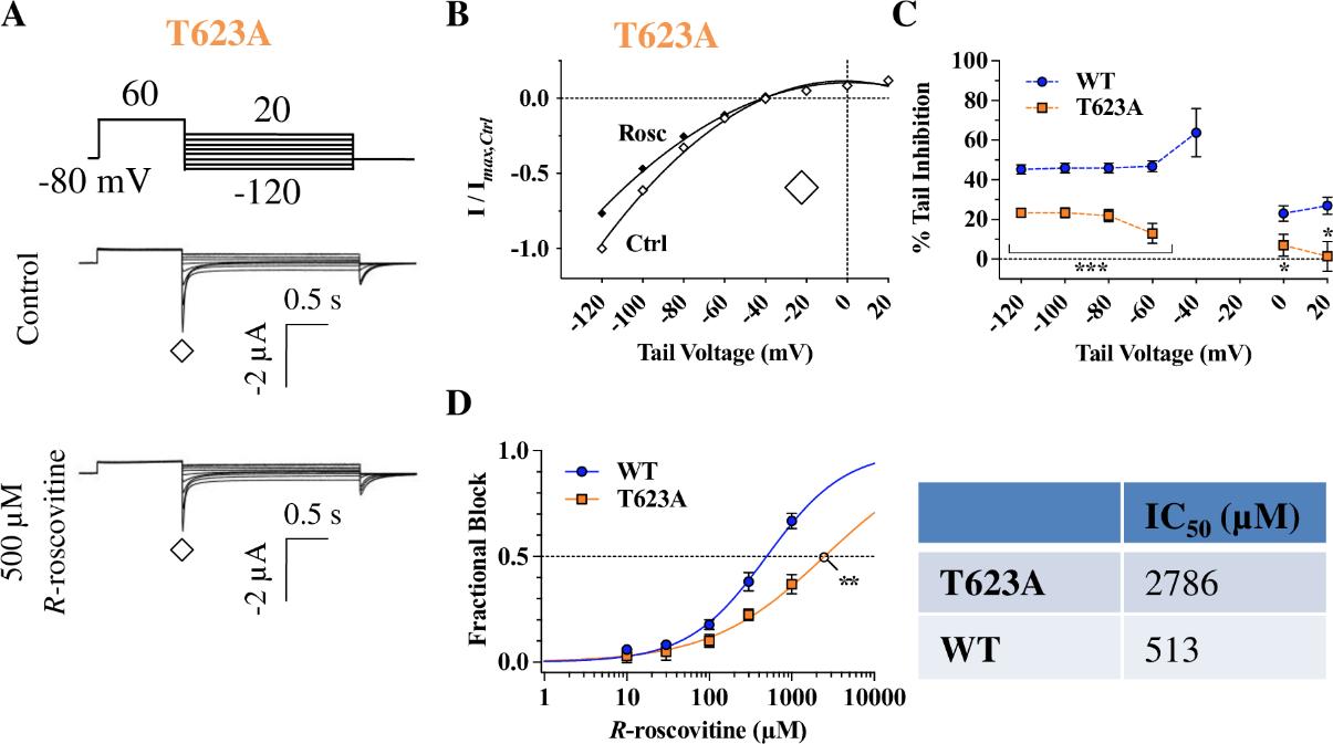 Fig 7. T623A hERG reduces R-roscovitine mediated inhibition. A) Voltage protocol and representative current traces of a cell expressing T623A before (Control) and during 500 μM R-roscovitine application. B) T623A tail I-V curves during the step repolarization protocol (currents measured at â). Quadratic fits generated Erev values (Ctrl = -39.7 ± 2.0 mV, Rosc = -40.1 ± 2.1 mV) that did not show a significant shift occurring with 500 μM R-roscovitine (p = 0.5995 for Ctrl vs. Rosc, n = 10, paired t-test). C) Percent tail inhibition of T623A hERG was significantly weaker over a range of voltages than WT inhibition (p < 0.05 for WT vs. T623A between +20 mV and -120 mV (excluding voltages close to the reversal potential; nWT = 10, nT623A = 10, one-way ANOVA). D) Compared to the WT IC50 (513 ± 43 μM), T623A IC50 was ~ 5.5-fold larger (2786 ± 488 μM; p = 0.0092) while the slope factor had a non-significant change from 1.1± 0.22 for WT to 0.7 ± 0.09 for T623A (p = 0.4901; nWT = 9, nT623A = 7, Kruskal-Wallis tests). * = P < 0.05, ** = P < 0.01, and *** = P < 0.001. |