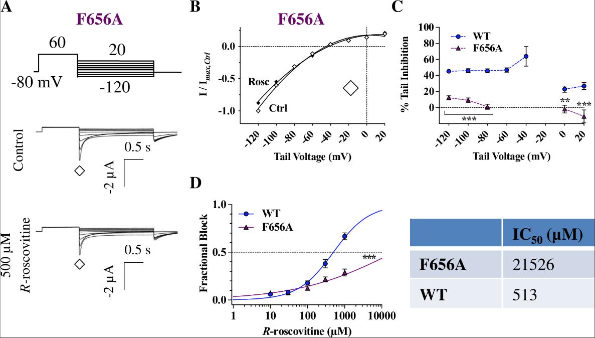 Fig 8. R-roscovitine inhibition is almost completely abolished in F656A hERG. A) Voltage protocol and representative current traces of a cell expressing F656A before (Control) and during 500 μM R-roscovitine application. B) F656A tail I-V curves during the step repolarization protocol (currents measured at â). Quadratic fits generated to obtain Erev values (Ctrl = -45.1 ± 1.1 mV, Rosc = -42.1 ± 1.7 mV) did in fact show a shift with drug block (p = 0.02, n = 9, paired t-test). C) F656A tail current inhibition was almost non-existent for most repolarized voltages, which was a substantial difference from WT inhibition (p < 0.01 for WT vs. F656A between +20 mV and -120 mV (excluding points close to the reversal potential), nWT = 10, nF656A = 9, one-way ANOVA). D) Concentration-response relationship for F656A hERG IC50 (21.5 ± 10.6 mM) shows a ~ 42-fold increase from WT IC50 (513 ± 43 μM; p = 0.0004); and a significant reduction in the slope of the Hill equation from 1.1 ± 0.22 for WT to 0.42 ± 0.04 for F656; p < 0.005; nWT = 9, nF656A = 5, Kruskal-Wallis tests. ** = P < 0.01, and *** = P < 0.001. |