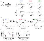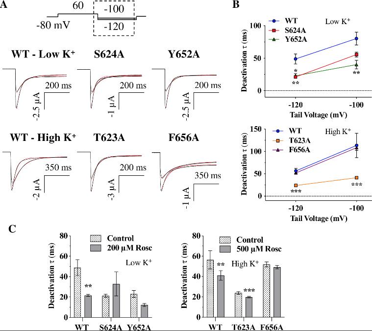 Fig 9. Deactivation time constants for hERG and its mutants. A) Representative traces from the indicated hERG constucts at -100 and -120 mV repolarization voltages. Tail currents (from the dash-boxed region of the voltage protocol) were fitted with a standard biexponential equation (red dashed line) to measure deactivation time constants (see methods). B) Average Ïfast for S624A, Y652A and T623A constructs at -120 mV were all significantly smaller than their respective WT controls (p = 0.0082, p = 0.0134, and p < 0.0001 respectively). At -100 mV, Y652A and T623A were significantly different from their respective WT controls (p = 0.0054 and p = 0.0009), while S624A was not (p = 0.0953). F656A was not different from WTHigh K+ (p = 0.4973 at -120 mV and p = 0.9430 at -100 mV). N = 6â10; one-way ANOVAs. C) Ïfast before (Control) and during R-roscovitine application at -120 mV. R-roscovitine sped up deactivation for WT (p = 0.0034) and T623A (p = 0.0009), but not for S624A (p = 0.312), Y652A (p = 0.2739), or F656A (p = 0.1708). N = 6â10; paired t-tests. R-roscovitine concentration was 200 μM for low K+ and 500 μM for high K+ solutions. * = P < 0.05, ** = P < 0.01, and *** = P < 0.001. |