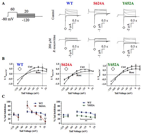 S1 Fig. Step repolarization protocols for WT, S624A, and Y652A in the presence or absence of R-roscovitine. A) Representative current traces elicited from the step repolarization voltage protocol shown to the left. WT, S624A, and Y652A tail currents were measured at their peak ( ) in the absence (top row) and presence of 200 µM R-roscovitine (bottom row). B) Maximal tail current amplitudes from A were plotted against the repolarization voltage to show reversal potentials, which were then compared between control and R-roscovitine. The shifts for WT (Erev = -80.16 ± 1.31 to -76.7 ± 1.33 mV; p = 0.0294, paired t-test) and S624A (Erev = -82.25 ± 1.27 mV to -77.17 ± 2.00 mV; p = 0.0301, paired t-test) were significant, but not for Y652A (Erev = -81.08 ± 1.28 mV to -80.61 ± 2.12 mV; p = 0.6238, paired t-test). C) Percent inhibition of tail currents during the step repolarization protocol, which were calculated from the values in B (* = P < 0.05, ** = P < 0.01; one-way ANOVAs). nWT = 14, and nS624A,Y652A = 9. |