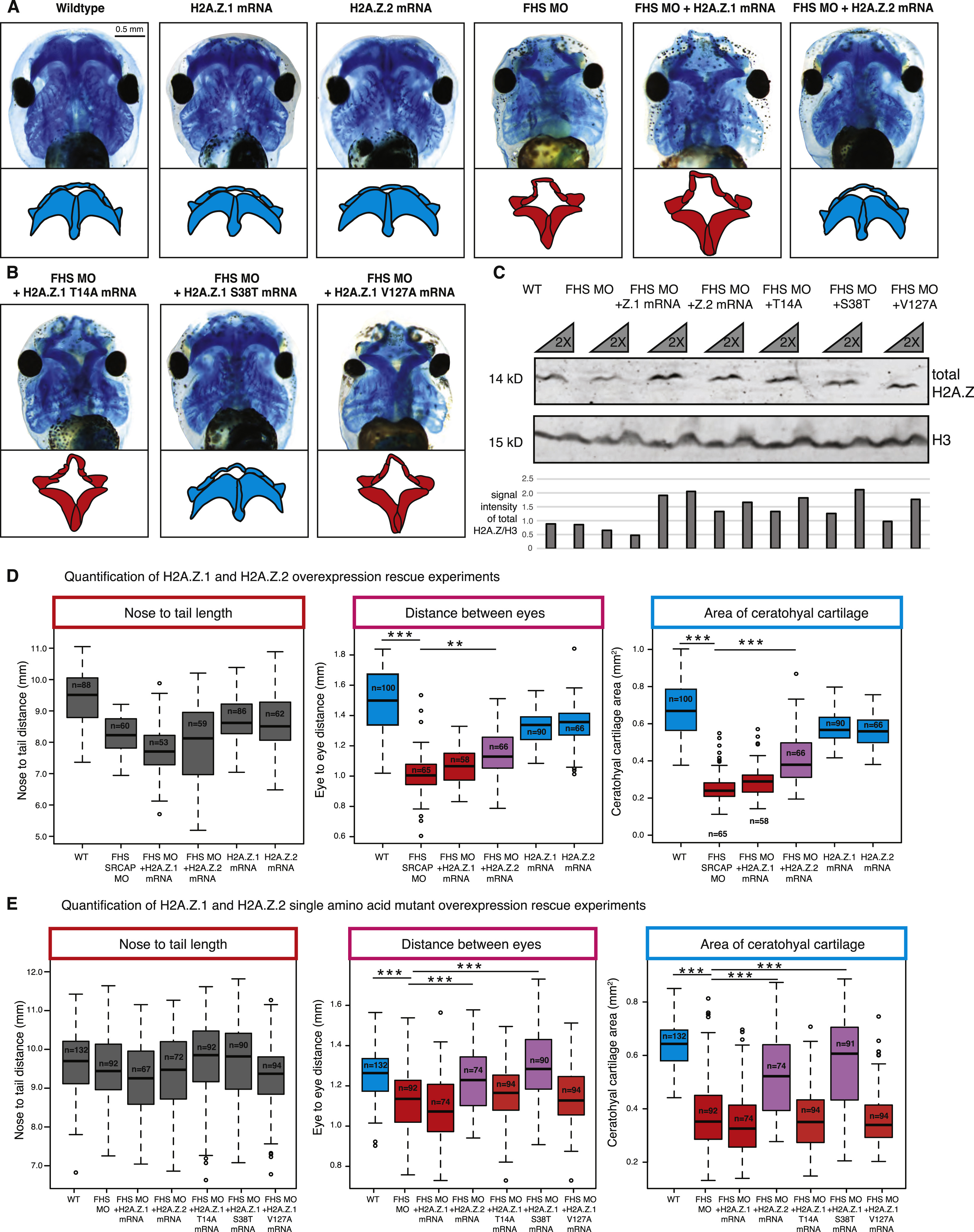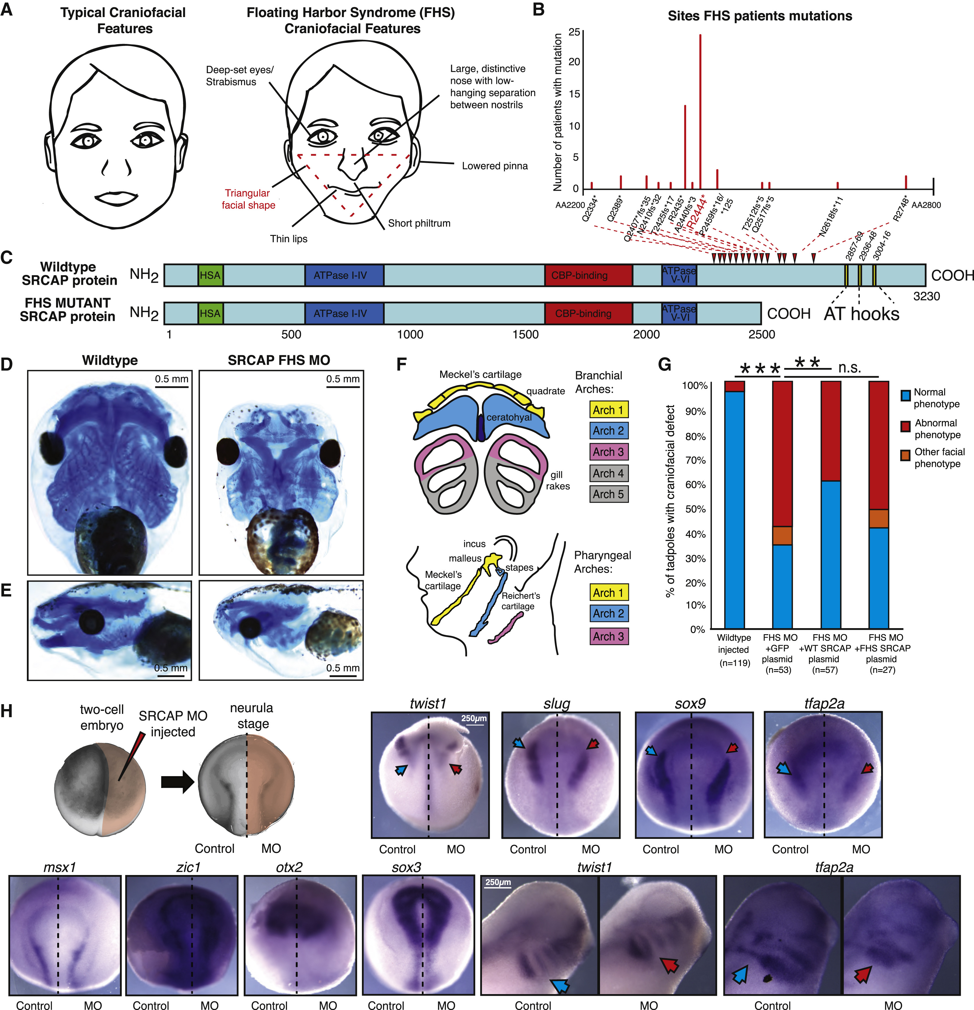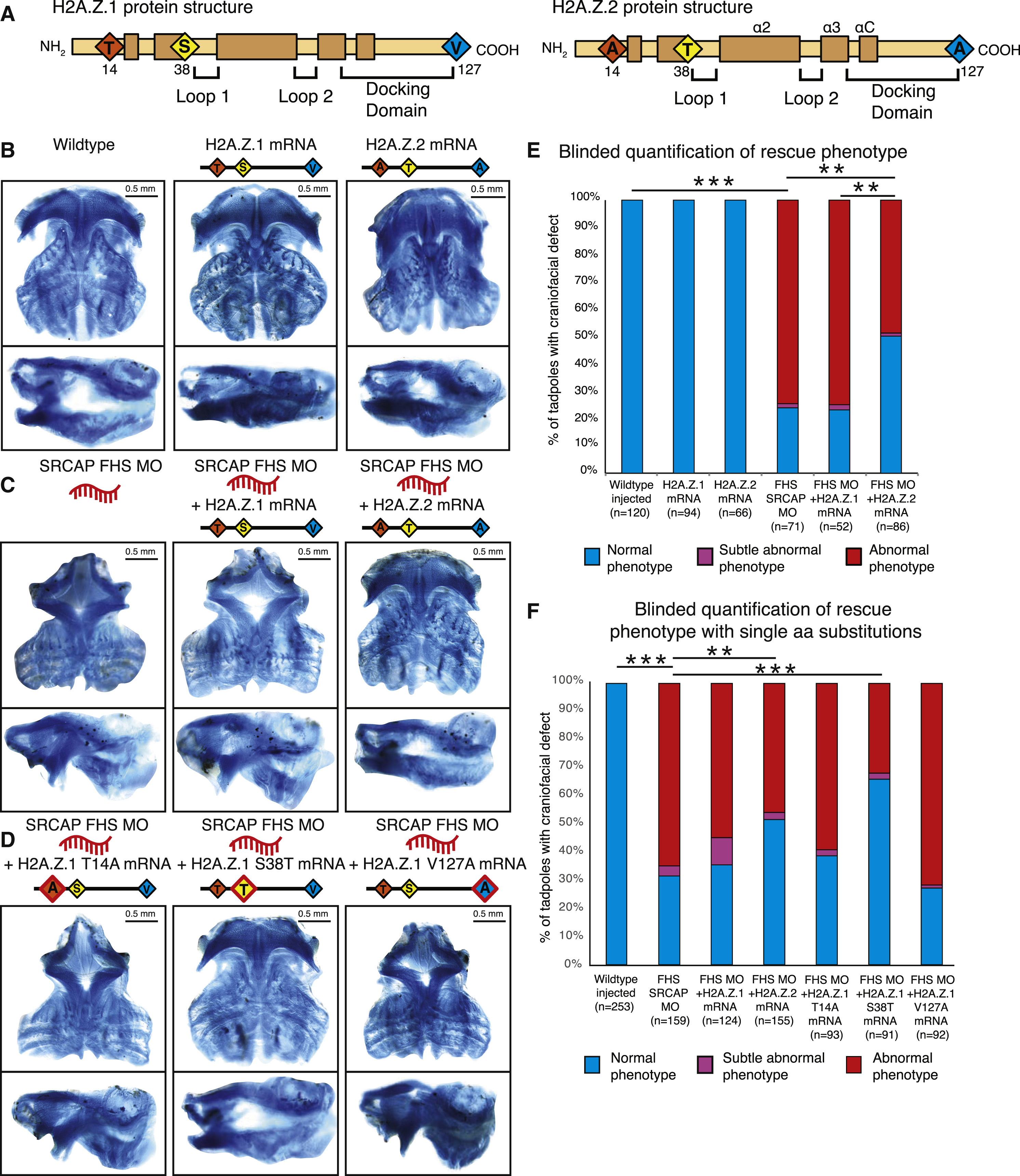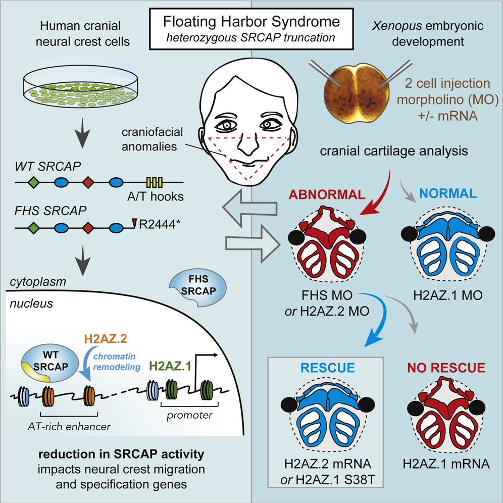 The developmental disorder Floating-Harbor syndrome (FHS) is caused by heterozygous truncating mutations in SRCAP, a gene encoding a chromatin remodeler mediating incorporation of histone variant H2A.Z. Here, we demonstrate that FHS-associated mutations result in loss of SRCAP nuclear localization, alter neural crest gene programs in human in vitro models and Xenopus embryos, and cause craniofacial defects. These defects are mediated by one of two H2A.Z subtypes, H2A.Z.2, whose knockdown mimics and whose overexpression rescues the FHS phenotype. Selective rescue by H2A.Z.2 is conferred by one of the three amino acid differences between the H2A.Z subtypes, S38/T38. We further show that H2A.Z.1 and H2A.Z.2 genomic occupancy patterns are qualitatively similar, but quantitatively distinct, and H2A.Z.2 incorporation at AT-rich enhancers and expression of their associated genes are both sensitized to SRCAP truncations. Altogether, our results illuminate the mechanism underlying a human syndrome and uncover selective functions of H2A.Z subtypes during development.
