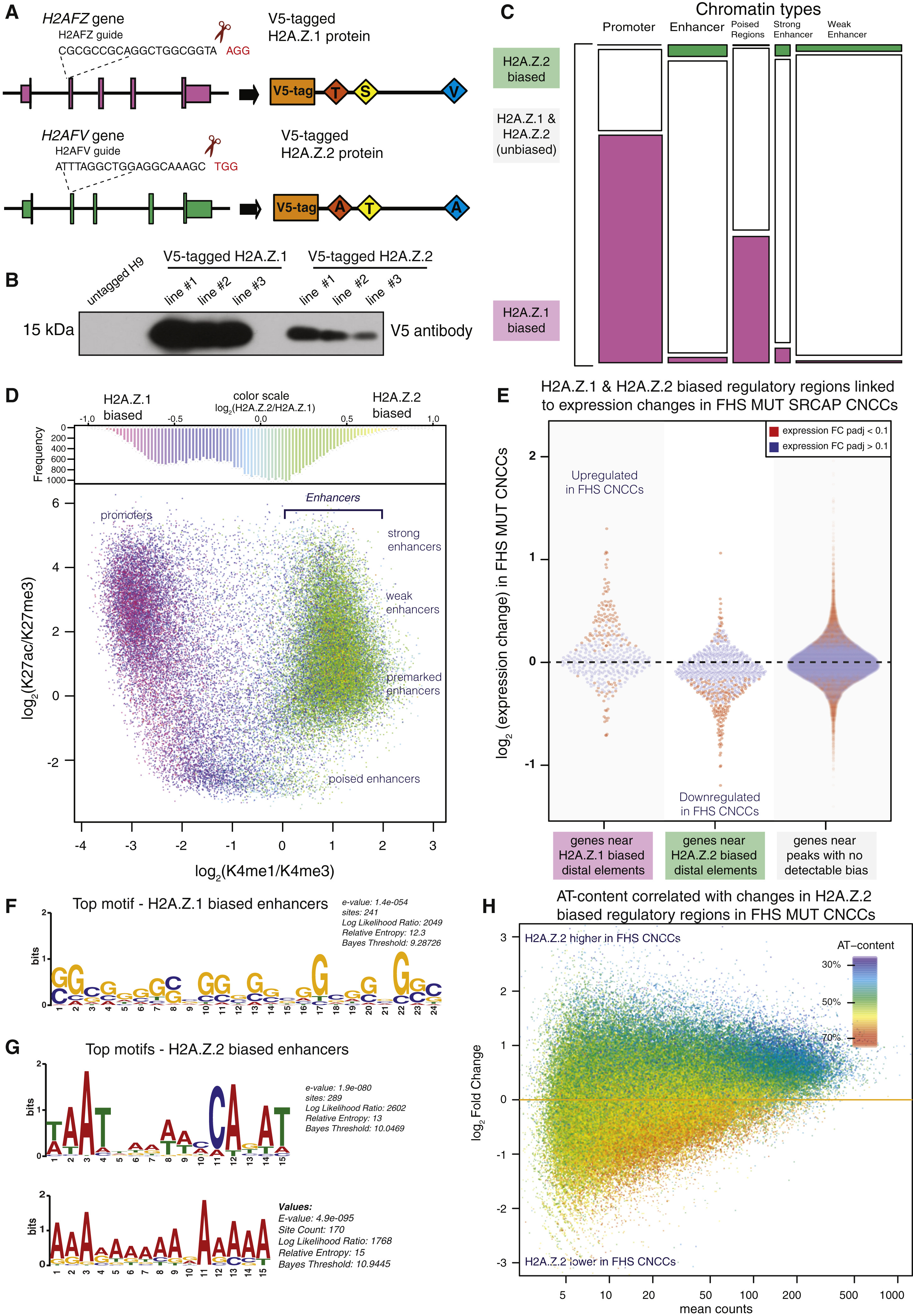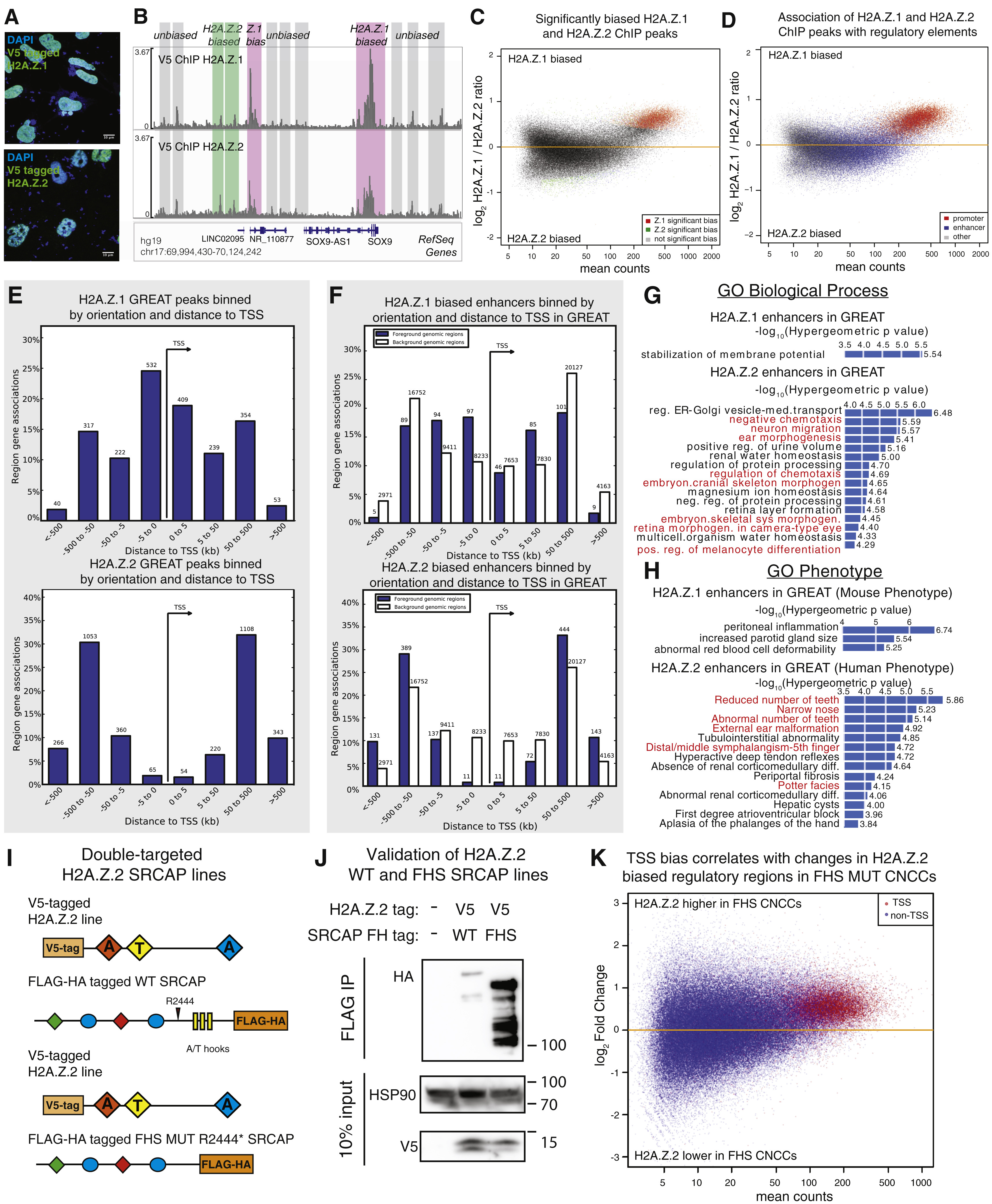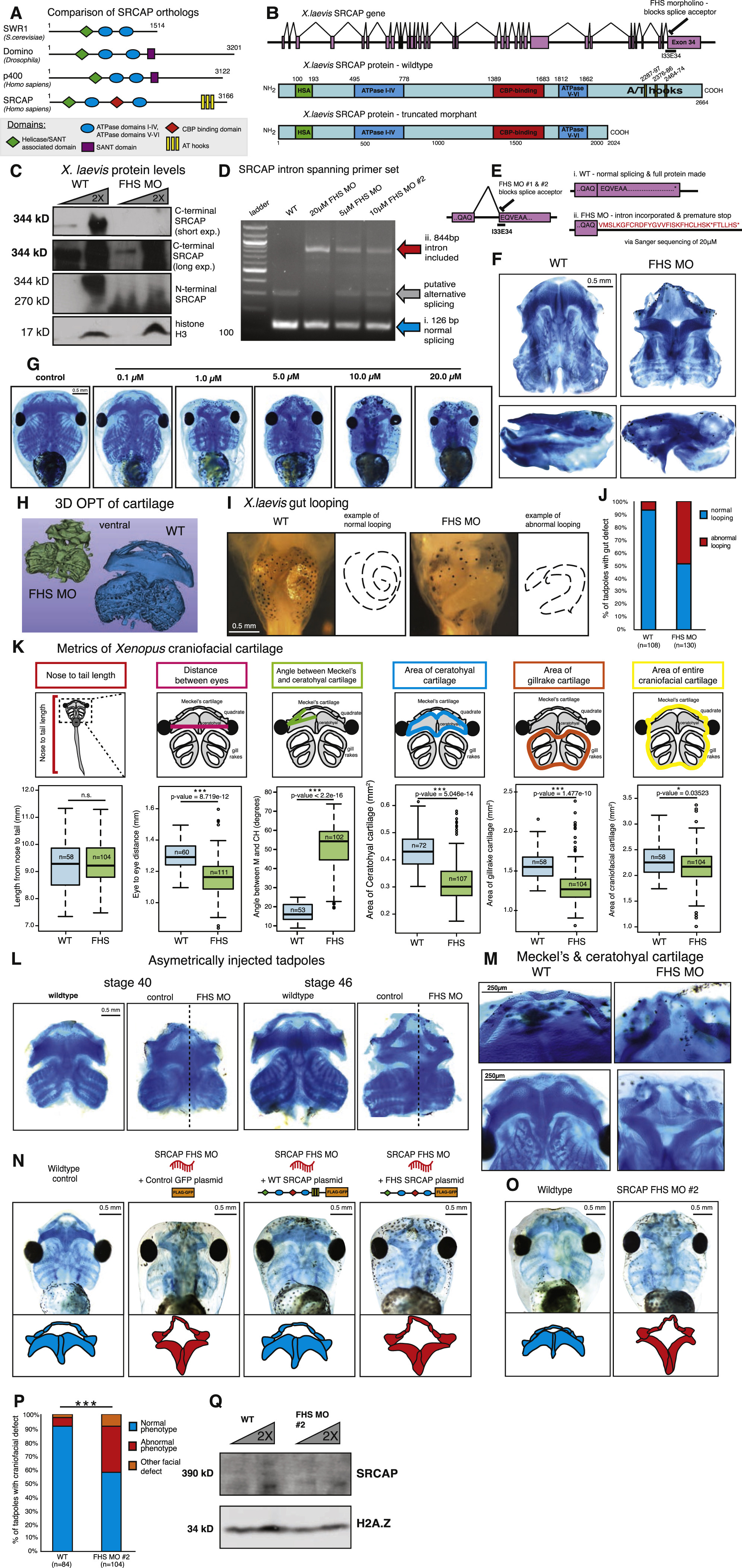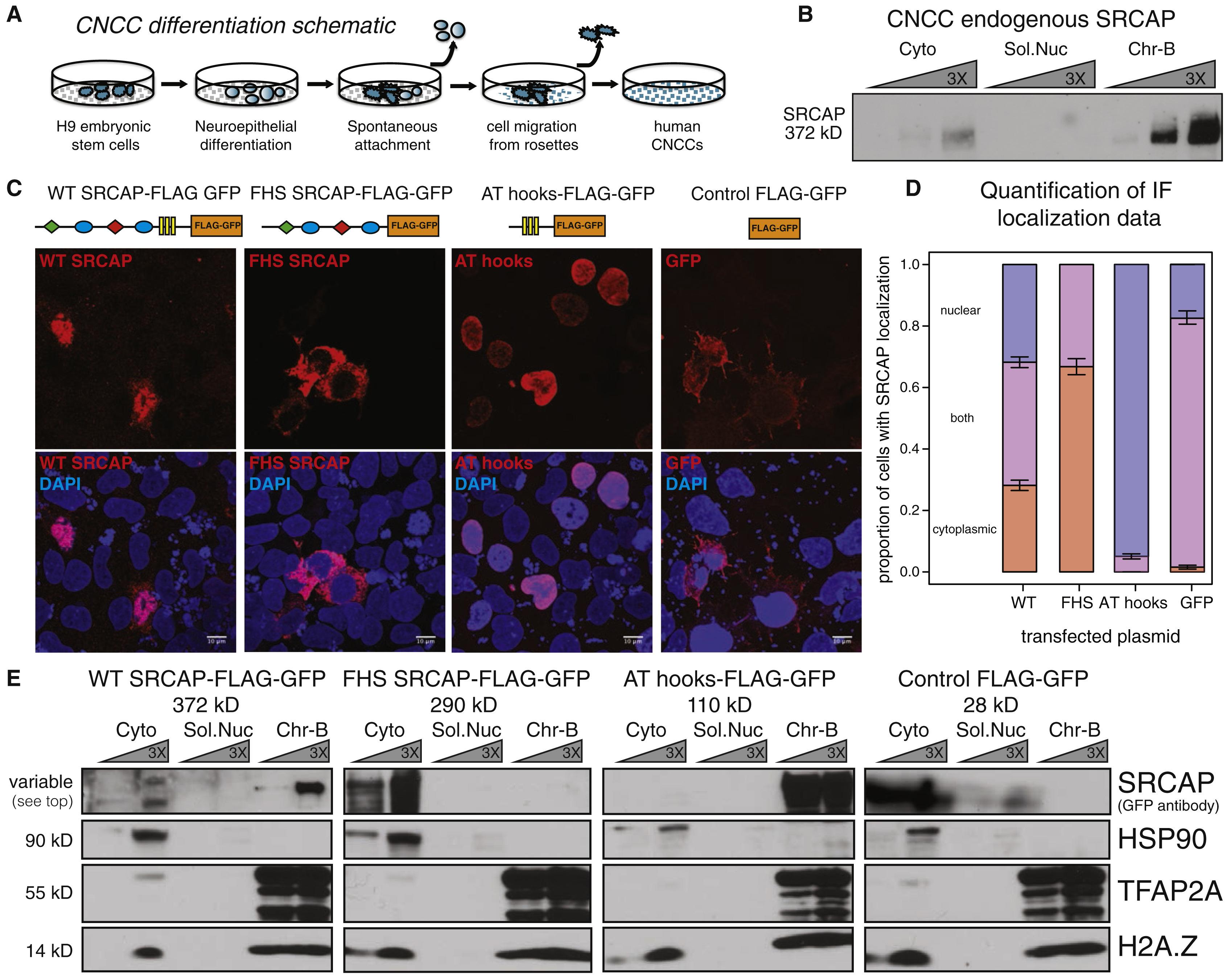 The developmental disorder Floating-Harbor syndrome (FHS) is caused by heterozygous truncating mutations in SRCAP, a gene encoding a chromatin remodeler mediating incorporation of histone variant H2A.Z. Here, we demonstrate that FHS-associated mutations result in loss of SRCAP nuclear localization, alter neural crest gene programs in human in vitro models and Xenopus embryos, and cause craniofacial defects. These defects are mediated by one of two H2A.Z subtypes, H2A.Z.2, whose knockdown mimics and whose overexpression rescues the FHS phenotype. Selective rescue by H2A.Z.2 is conferred by one of the three amino acid differences between the H2A.Z subtypes, S38/T38. We further show that H2A.Z.1 and H2A.Z.2 genomic occupancy patterns are qualitatively similar, but quantitatively distinct, and H2A.Z.2 incorporation at AT-rich enhancers and expression of their associated genes are both sensitized to SRCAP truncations. Altogether, our results illuminate the mechanism underlying a human syndrome and uncover selective functions of H2A.Z subtypes during development.