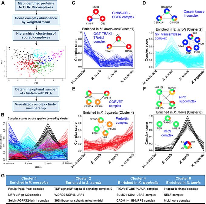 (A) Proteins detected in this study were mapped to known human protein complexes listed in CORUM. (B) A complex score was calculated from the MS1 peak area of individual protein components of each complex. These complexes were then clustered into 6 clusters and analyzed further. (C–F) Individual clusters are plotted along with example protein complexes, demonstrating the underlying abundance data that drove the complex clustering. (G) Three representative complexes for each cluster are listed. See S9 Table for numerical data underlying figure. CORUM, Comprehensive Resource of Mammalian Protein Complexes.