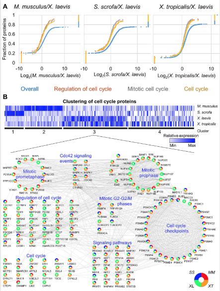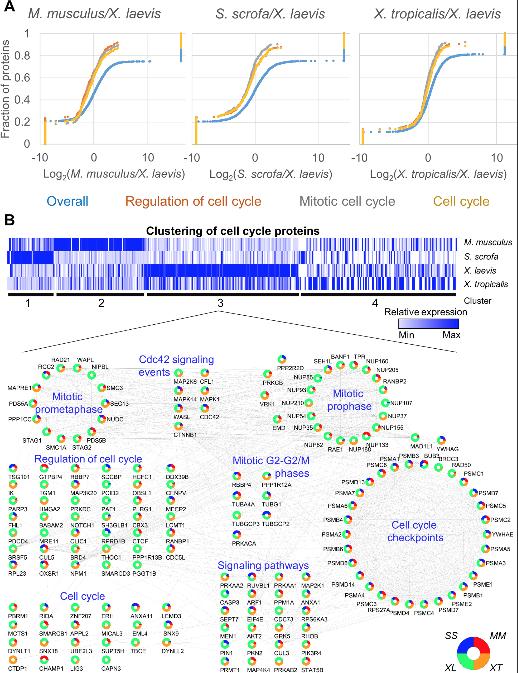 (A) Pairwise GSEA was carried out between X. laevis and the 3 other species, revealing an enrichment (adjusted p ≤ 0.05) in cell cycle related proteins in X. laevis. (B) All proteins found in any enriched cell cycle related category by GSEA were clustered using k means (k = 4). Relative protein abundance is shown. The proteins found in cluster 3 were further analyzed in Cytoscape and grouped by function to show the interrelated nature of the proteins enriched in this cluster. See S13 Table and S14 Table for numerical data underlying figure. GSEA, Gene Set Enrichment Analyses.