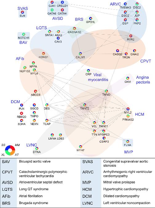 A diagram of detected proteins with links to human heart disease reported in the KEGG database was created in Cytoscape showing relative protein abundance data across the 4 species examined here, as well as known proteinâprotein interactions between these heart diseaseârelated proteins. See S8 Table for numerical data underlying figure. AFib, atrial fibrillation; ARVC, arrhythmogenic right ventricular cardiomyopathy; AVSD, atrioventricular septal defect; BAV, bicuspid aortic valve; BRS, brugada syndrome; CPVT, catecholaminergic polymorphic ventricular tachycardia; DCM, dilated cardiomyopathy; HCM, hypertrophic cardiomyopathy; LQTS, long QT syndrome; LVNC, left ventricular noncompaction; MVP, mitral valve prolapse; SVAS, congenital supravalvar aortic stenosis.