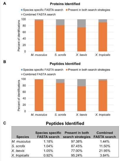 Percent of (A) proteins and (B) peptides identified uniquely in either a species-specific (blue bars) or combined species (gray bars) search. Orange bars represent proteins and peptides found in both search modes. (C) Table of values from (B). See S2 Table for numerical data underlying figure. ID, Identification.