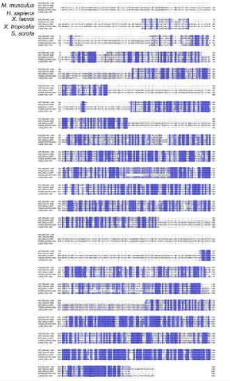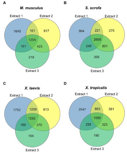 (A) M. musculus, (B) S. scrofa, (C) X. laevis, and (D) X. tropicalis.
