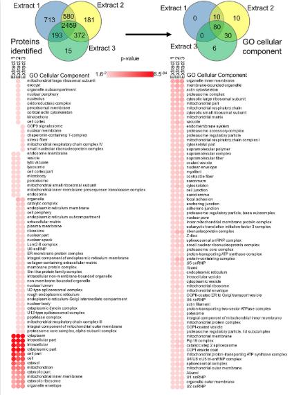GO cellular component terms and p-value enrichments are shown for terms enriched in each extract. GO, Gene Ontology.