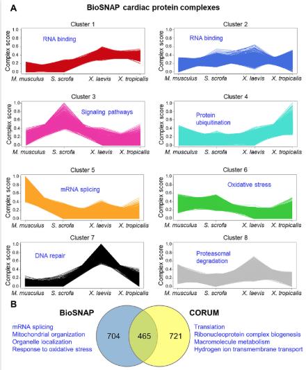 (A) The 8 clusters resulting from mapping the 4 species data set to cardiac complex information in BioSNAP are shown. One of the top GO terms for each cluster is show in blue. (B) Comparison of BioSNAP and CORUM complex analysis. Top enriched GO terms for each unique set of proteins are listed. See S10 Table for numerical data underlying figure. CORUM, Comprehensive Resource of Mammalian Protein Complexes; GO, Gene Ontology.