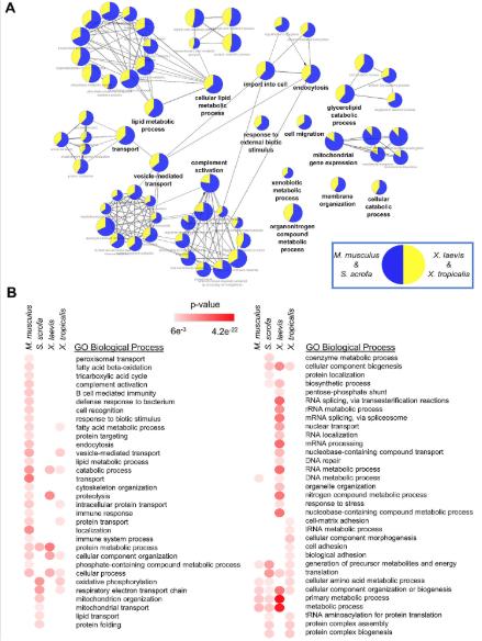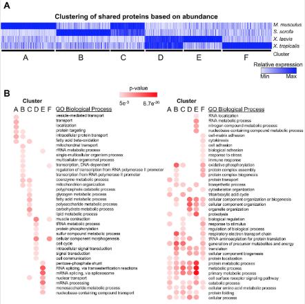 (A) The proteins uniquely identified in the mammalian and Xenopus species were used to examine evolutionary driven protein expression differences in these organisms using ClueGO (B) Proteins found uniquely in one species only were combined with the cluster of proteins that were more highly expressed in that species and analyzed for overrepresentation of GO biological process terms. The p-values of the significantly enriched terms are shown in a heat map. See S12 Table for numerical data underlying figure. GO, Gene Ontology.