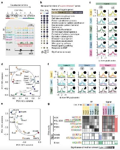 Fig 3. Chromatin engagement of TFs and signal mediators during the maternal-to-zygotic transition. a Chromatin profiling (ChIP-Seq) of selected TFs and signal mediators from the 32- or 1024-cell stage (32, 1âK) to the early (eG) and late (lG) gastrula and the early tailbud (eTailbud) stage. In all subsequent figure panels, the chromatin factors and developmental stages profiled are consistently colour-coded as illustrated here. The excerpt of multiple chromatin tracks shows the binding of maternal TFs (Sox3, Foxh1 and VegT) and signal mediators (β-catenin, Smad2 and Smad1) to the siamois2 (sia2 and sia2l) super-enhancer at the 1024-cell stage (see Supplementary Fig. 3a for the temporal progression of chromatin engagement to the siamois2 and ventx super-enhancers). b Bubble plot shows significantly enriched biological processes associated with zygotic super-enhancer+ genes (i.e., genes possessing engaged super-enhancers â¤5âkb from their active TSS at indicated developmental stages). c, f Meta-plots (mean [solid line]â±âs.d. [dotted line or polygon]) summarise the level of RNAPII (c) or signal mediator (f) engagement across 2000 pCRMs most frequently occupied by the indicated TFs or signal mediators at the 1024-cell and early gastrula stage, respectively. The pie chart next to each meta-plot shows the percentage of these TF+ or signal mediator+ pCRMs bound (ChIP â¥2x input tag density) by RNAPII or signal mediators, respectively. See Supplementary Note 1 for percentage numbers. d Biplot of principal component (PC) 1 (accounting for 40% variance) and 2 (28% variance) shows the relationship of TF and signal mediator binding levels across â¼12,500 highly engaged pCRMs (compiled from the 2000 pCRMs with the highest DNA occupancy levels detected per protein and developmental stage) over several developmental stages. Note that developmental time (arrow) separates these profiles best. e Biplot of PC1 (60% variance) and PC2 (18% variance) for the temporal progression of RNAPII and TF binding levels across the same set of pCRMs as in d. g Heat map shows the statistical significance (hypergeometric p-value) of finding TF- and signal-specific DNA consensus motifs (y-axis) across 2000 pCRMs most frequently occupied by the indicated TFs or signal mediators (x-axis) |