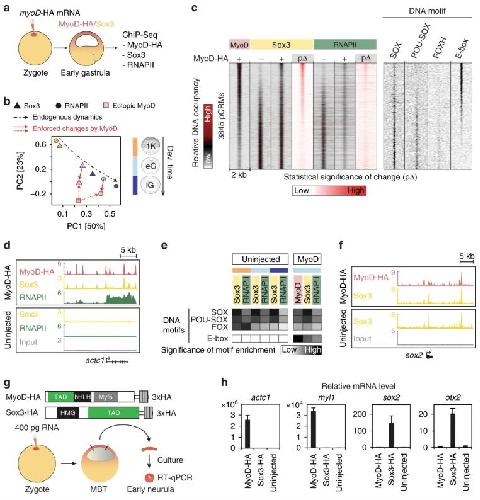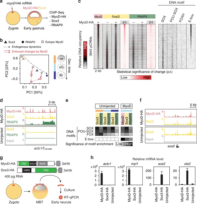 Fig. 4. Ectopic expression of the muscle determinant MyoD reveals the effect of co-expressed TFs on chromatin engagement and gene expression. a Experimental design: Ectopic expression of the MyoD-HA mRNA construct injected into the animal hemisphere followed by the genome-wide chromatin profiling (ChIP-Seq; nâ=â2 biologically independent samples) of MyoD-HA, Sox3 and RNAPII in early gastrula embryos. b Biplot of principal component (PC) 1 (accounting for 50% variance) and 2 (23% variance) shows the relationship of Sox3 (triangle), RNAPII (circle) and MyoD-HA (square) binding levels across MyoD+ and/or Sox3+ pCRMs. Arrows show the normal temporal dynamics of Sox3 and RNAPII binding (black dash-dotted line) and the MyoD-enforced (red dotted line) changes to them (red solid line) at early gastrula stage. Fill colour of symbols represents the developmental stage as indicated, while line colours refer to whether MyoD-HA was expressed (red) or not (black). Abbreviations used for the developmental timeline: 1âK, 1024-cell stage; eG and lG, early and late gastrula stage. c Heat map of the DNA occupancies of 3845 pCRMs and enriched DNA motifs sorted by the significance of MyoD-HA-enforced changes (pâ) to Sox3 binding levels. d, f Snapshot of chromatin co-recruitment to the super-enhancers of canonical MyoD and Sox3 target genes actc1Â (d) and sox2Â (f), respectively. e Heat map shows the significance of DNA motif enrichments (y-axis) at 10,000 pCRMs most frequently occupied by the indicated proteins in uninjected and MyoD-HA injected embryos (x-axis). g Experimental design: Animal cap assay to quantify MyoD- or Sox3-enforced transcription. h RT-qPCR results from the animal cap assay. Error bars, meanâ+âs.d. (nâ=â2 biologically independent samples) |