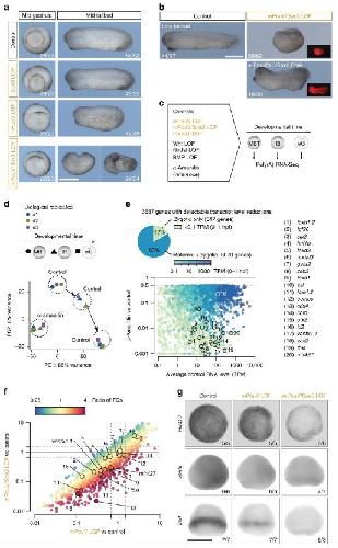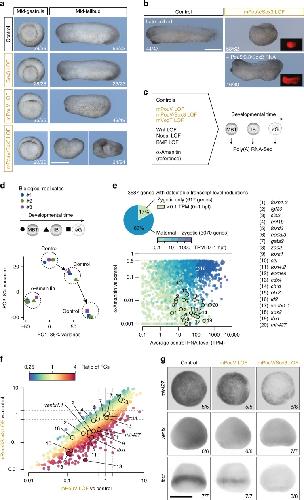Fig 6. Synergistic relationship between maternal Pou5f3 (mPouV) and Sox3. a Morphological phenotypes caused by single and combined LOFs of Sox3 and mPouV when control embryos reached mid-gastrula and mid-tailbud stage. See also Supplementary Movie 1. b Phenotypical rescue of mPouV/Sox3 LOF embryos by the co-injection of both X. laevis Pou5f3.3 and Sox2 mRNA alongside mCherry mRNA as a tracer. c Experimental design: Profiling the poly(A) RNA transcriptome (nâ=â3 biologically independent samples) over three consecutive developmental stages under indicated conditions. Abbreviations used for the developmental timeline: MBT, midblastula transition; lB, late blastula; and eG, early gastrula. d Biplot of PC1 (accounting for 86% variance) and PC2 (8% variance) shows the relationship of developmental stage-specific poly(A) RNA transcriptomes of control and α-amanitin-injected embryos in biological triplicates (#1â3). e Detection of 3687 zygotic genes with reduced transcript levels (â¥â50%, FDR â¤10%) in α-amanitin-injected embryos. These genes were used as reference for all other LOFs. Dots in scatterplot are coloured according to the maternal contribution56 to the transcript level of each of these zygotic genes. f Scatterplot of transcript fold changes (FCs) caused by mPouV and mPouV/Sox3 LOFs with dots coloured according to the ratio of FCs. Numbered dots refer to some developmentally relevant genes listed in e. g Early gastrula-staged WMISH: mir427, animal view; ventx, lateral view, ventral side facing right; and tbxt, dorsal view. Numbers in the right bottom corner of each image refer to the count of embryos detected with the displayed WMISH staining among all embryos analysed per condition and in situ probe. Scale bars (a, b, g), 0.5âmm |