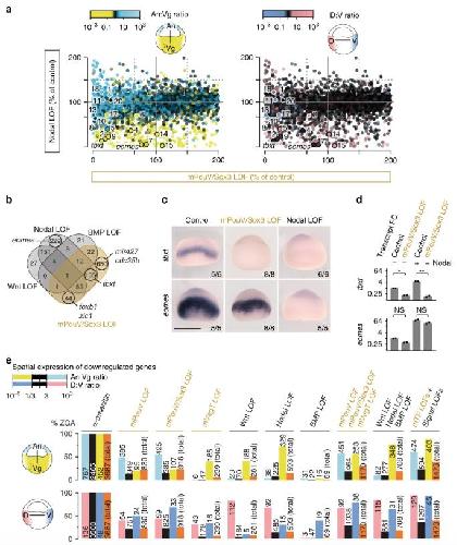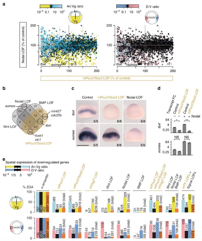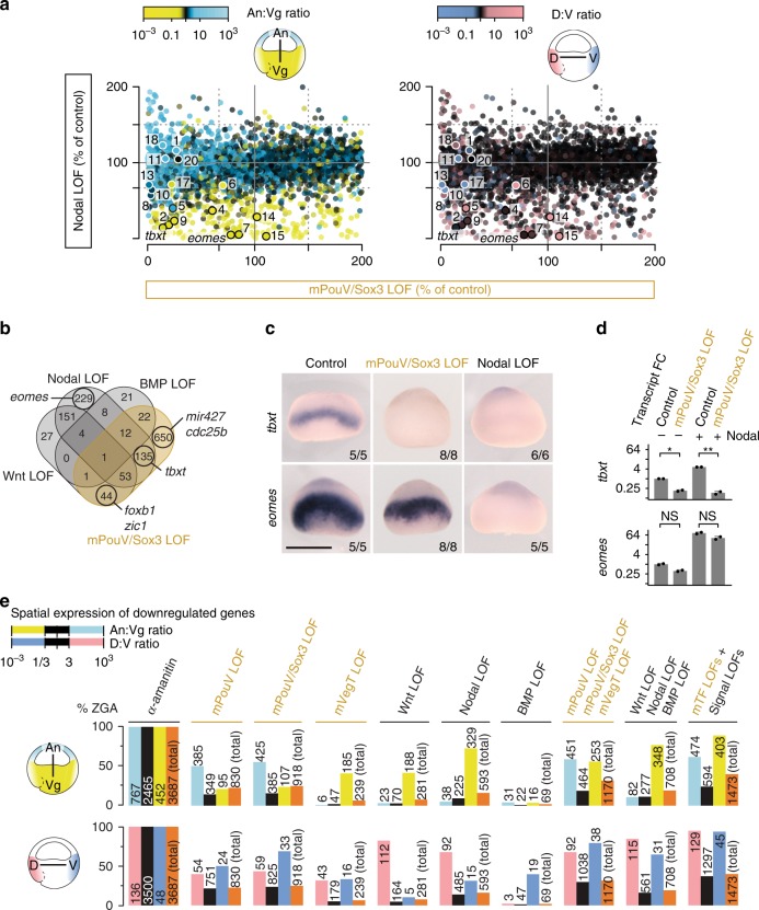 Fig. 7. Signal-induced regionalisation of ZGA depends on maternal TFs. a Transcriptional comparison of zygotic genes between the LOFs of maternal PouV/Sox3 and Nodal signalling. Dots are coloured according to the normal ratio of transcript levels (regional expression79) across the animal-vegetal (An:Vg) or dorso-ventral (D:V) axis. Numbered dots refer to genes listed in Fig. 6e. b Venn diagram of genes downregulated by the mPouV/Sox3 LOF (orange) or the LOF of single signal transduction pathways (black). c Early gastrula-staged WMISH for tbxt and eomes under indicated LOFs. Scale bar, 0.5âmm. d Quantification of tbxt and eomes transcript levels in control and mPouV/Sox3 LOF animal caps with or without stimulated Nodal signalling. Error bars, meanâ+âs.d. (nâ=â2 biologically independent samples). Two-tailed Studentâs t-test: *pâ=â0.014; **pâ=â0.005; and NS, not significant (pââ¥â0.02). e Bar graphs show the percentage (and number) of downregulated zygotic genes (% ZGA under indicated LOFs) grouped by the normal ratio of transcript levels (regional expression79) across the animal-vegetal (An:Vg) and dorso-ventral (D:V) axis |