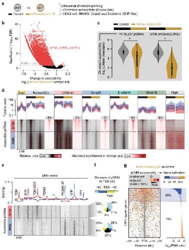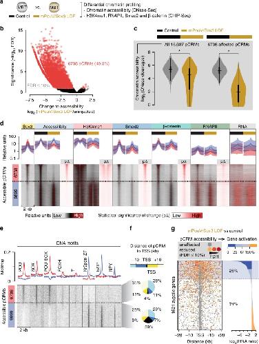 Fig 8. Maternal pluripotency TFs mPouV and Sox3 remodel â¼40% of the accessible chromatin landscape to contribute to â¼25% of ZGA. a Used approach to reveal the effect of mPouV/Sox3 on chromatin accessibility (DNase-Seq) and chromatin composition (ChIP-Seq) around the MBT (nâ=â2 biologically independent samples). b Double-logarithmic volcano plot shows massive chromatin accessibility (DNase cleavage) reductions caused by mPouV/Sox3 LOF. pCRMs (dots) with significant accessibility changes (FDR â¤10%) are marked in red. c Violin plots show the comparison of chromatin accessibility (DNase cleavages) between uninjected and mPouV/Sox3 LOF embryos at all and affected (FDR â¤10%) pCRMs. Wilcoxon test: *pâ<â2.2âÃâ10â16. d Normalised meta-plots (top row, meanâ±âs.d.) and heat maps (bottom row) show the level of chromatin accessibility, chromatin engagements and RNA across accessible pCRMs in uninjected and mPouV/Sox3 LOF embryos. RNA was profiled at and beyond the MBT as shown in Fig. 6c. In the heat map, the pCRMs are sorted and grouped by significantly reduced DNase cleavages under mPouV/Sox3 LOF: red group, affected (FDR â¤10%) and blue group, unaffected (FDR >10%). These groups are represented in the meta-plots. Each heat map under mPouV/Sox3 LOF are followed by a heat map showing the statistical significance (Wald test) of changes (pâ) caused by mPouV/Sox3 LOF. e Heat map shows the occurrence of DNA motifs at accessible pCRMs sorted and grouped as in d. f Pie charts summarise the distribution of distances (kb) to nearest zygotic TSSs of affected (top pie chart) and unaffected (bottom pie chart) pCRMs. g Panel compares the effect of mPouV/Sox3 LOF on chromatin accessibility and RNAPII-mediated gene expression. Plot to the left shows the localisation of accessible pCRMs (affected, dot coloured in orange to red with FDR decreasing from 10%; and unaffected, grey dot) relative to the zygotic TSSs that are active by the MBT92 and produce enough RNA transcripts to show significant ⥠two-fold reductions upon α-amanitin injection (Fig. 6e). Gene loci are sorted by mPouV/Sox3 LOF-induced transcript fold changes as shown in the log-scaled bar graph to the right |
