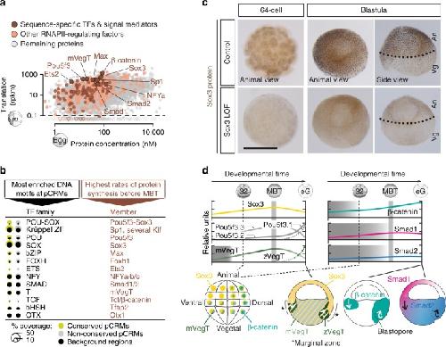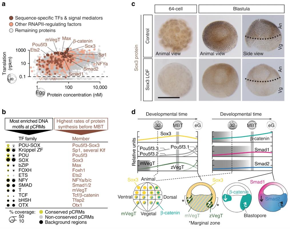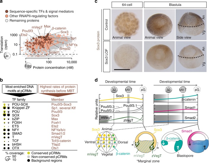 Fig. 2. Search for ZGA-critical proteins based on their significantly enriched DNA recognition motifs at accessible and engaged (RNAPII+/H3K4me1+) pCRMs and their high translation frequency before the MBT. a Maternal protein concentrations in the egg13 versus ribosome footprint (translation) levels at the 8-cell stage14. Most frequently translated representatives of various TF families are labelled. b Matching canonical pCRM-enriched DNA motifs (sorted by statistical significance) with frequently translated TFs and signal mediators. c WMIHC of Sox3 protein in control and Sox3 loss-of-function (LOF) embryos at the 64-cell and blastula stage. Nuclear accumulation of Sox3 protein was detected in both the animal (An) and vegetal (Vg) hemisphere of control embryos. Scale bar, 0.5âmm. d Graphical illustration of protein levels (derived from mass spectrometry data42) and nuclear localisations (mainly derived from WMIHC, see references below) of selected TFs and signal mediators based on our and previously published results: Sox3 (this study and ref. 50), mPouV (Pou5f3.2 and Pou5f3.3) and (zygotic) Pou5f3.1 (deduced from transcript data15), mVegT and zVegT16, β-catenin10,17, Smad1 (this study and refs. 10,18) and Smad2 (this study and refs. 10,18). Shaded boxes indicate periods of non-nuclear protein localisation. Arrows indicate tissue movements of gastrulation. Abbreviations used for the developmental timeline: 8 and 32, 8-cell and 32-cell stage; MBT, mid-blastula transition; and eG, early gastrula stage |