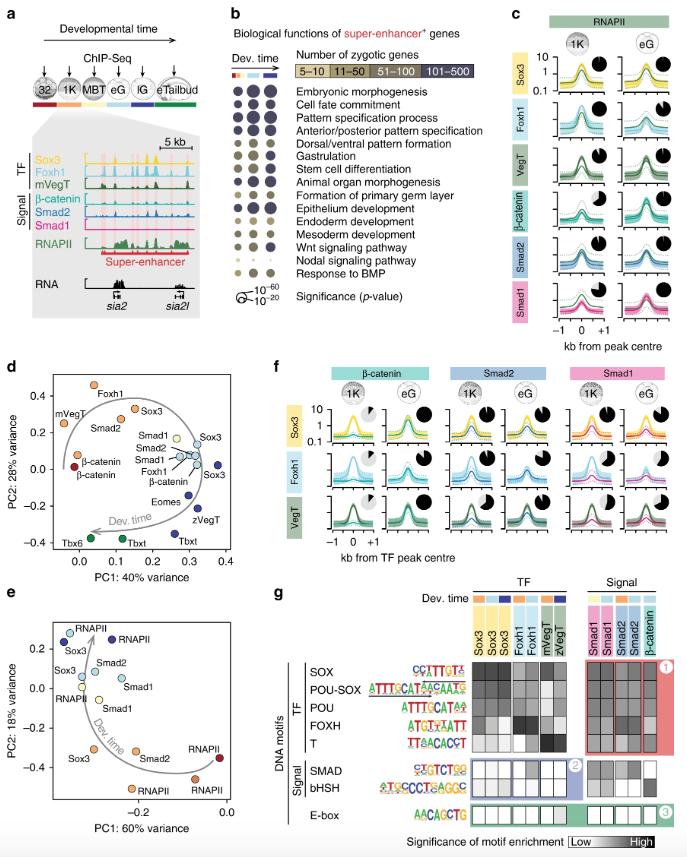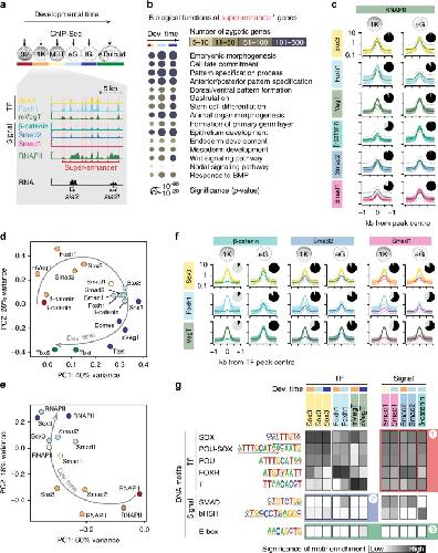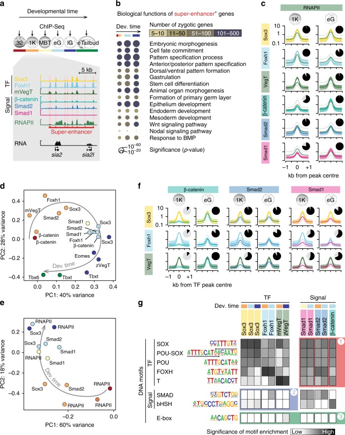 Fig. 3. Chromatin engagement of TFs and signal mediators during the maternal-to-zygotic transition. a Chromatin profiling (ChIP-Seq) of selected TFs and signal mediators from the 32- or 1024-cell stage (32, 1âK) to the early (eG) and late (lG) gastrula and the early tailbud (eTailbud) stage. In all subsequent figure panels, the chromatin factors and developmental stages profiled are consistently colour-coded as illustrated here. The excerpt of multiple chromatin tracks shows the binding of maternal TFs (Sox3, Foxh1 and VegT) and signal mediators (β-catenin, Smad2 and Smad1) to the siamois2 (sia2 and sia2l) super-enhancer at the 1024-cell stage (see Supplementary Fig. 3a for the temporal progression of chromatin engagement to the siamois2 and ventx super-enhancers). b Bubble plot shows significantly enriched biological processes associated with zygotic super-enhancer+ genes (i.e., genes possessing engaged super-enhancers â¤5âkb from their active TSS at indicated developmental stages). c, f Meta-plots (mean [solid line]â±âs.d. [dotted line or polygon]) summarise the level of RNAPII (c) or signal mediator (f) engagement across 2000 pCRMs most frequently occupied by the indicated TFs or signal mediators at the 1024-cell and early gastrula stage, respectively. The pie chart next to each meta-plot shows the percentage of these TF+ or signal mediator+ pCRMs bound (ChIP â¥2x input tag density) by RNAPII or signal mediators, respectively. See Supplementary Note 1 for percentage numbers. d Biplot of principal component (PC) 1 (accounting for 40% variance) and 2 (28% variance) shows the relationship of TF and signal mediator binding levels across â¼12,500 highly engaged pCRMs (compiled from the 2000 pCRMs with the highest DNA occupancy levels detected per protein and developmental stage) over several developmental stages. Note that developmental time (arrow) separates these profiles best. e Biplot of PC1 (60% variance) and PC2 (18% variance) for the temporal progression of RNAPII and TF binding levels across the same set of pCRMs as in d. g Heat map shows the statistical significance (hypergeometric p-value) of finding TF- and signal-specific DNA consensus motifs (y-axis) across 2000 pCRMs most frequently occupied by the indicated TFs or signal mediators (x-axis) |