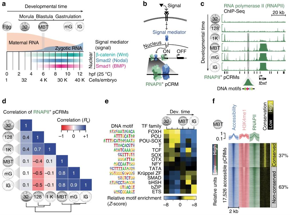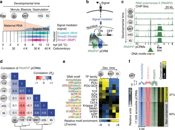 Fig. 1. Characterisation of pCRMs instructing ZGA. a Timeline (hpf, hours post-fertilisation, at 25â°C) of the maternal-to-zygotic transition and earliest signalling events (nuclear accumulation of Wnt, Nodal and Bmp signal mediators β-catenin, Smad2 and Smad1, respectively) during early X. tropicalis development up to the late gastrula embryo (12âhpf) with â¼40,000 (40âK) cells. b Signal transduction pathway causing signal mediators to enter the nucleus and engage with pCRMs (e.g., marked by RNAPII). c Snapshot of RNAPII recruitment to pCRMs of the zygotic gene locus tbxt from the 32-cell to the late gastrula stage. The underlying DNA sequence of RNAPII+ pCRMs are used to discover enriched DNA motifs de novo (illustrated as coloured arrows for one RNAPII+ pCRM). d Spearman correlations (Rs) of RNAPII binding levels across â¼27,000 pCRMs (Supplementary Data 2) between the indicated developmental stages. e Temporal enrichment (Z-score) of consensus DNA motifs known to be recognised by indicated TF families among RNAPII+ pCRMs. f MBT-staged heat map of DNase-probed chromatin accessibility, RNAPII binding and H3K4me1 marking (nâ=â2 biologically independent samples) across â¼17,500 pCRMs (Supplementary Data 3) grouped by sequence conservation levels (phastCons) and sorted by the statistical significance of pCRM accessibility. Abbreviations used for the developmental timeline: 32, 128 and 1âK, 32-, 128- and 1024-cell stage; MBT, mid-blastula transition; eG, mG and lG, early, mid- and late gastrula stage |